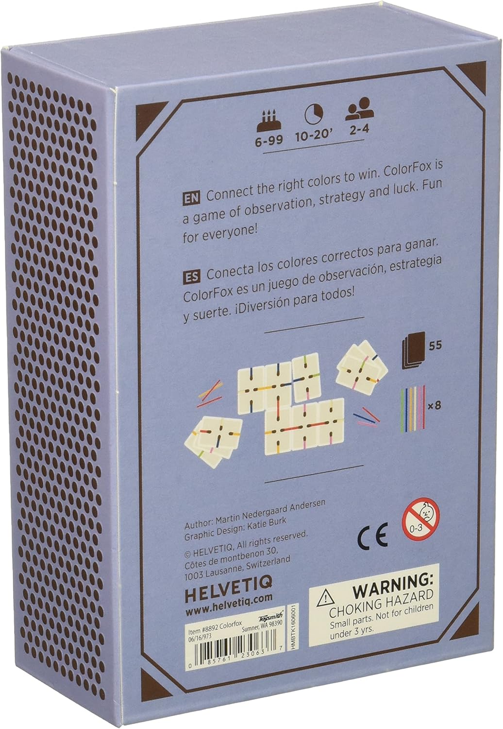 Helvetiq publishes games for children, families and adults in print and digital formats. These games are designed to test people's knowledge in a fun and instructive way. Colorado is a game of dominoes with a tactical twist. Shuffle the cards, deal three to each player, and then turn over a card in the center of the table. The game is a bit like dominoes, in that you have to place the colored matches next to the same color (and facing the same direction). Connect as many cards as possible to win color combinations. Outperform other players by collecting the most complete match sets to win the game. When you match a match color, you receive a match of that same color from the match bank. The colored fox measures 5-1/2 inches x 3-3/4 inches x 2 inches. This article is recommended for ages eight and up.