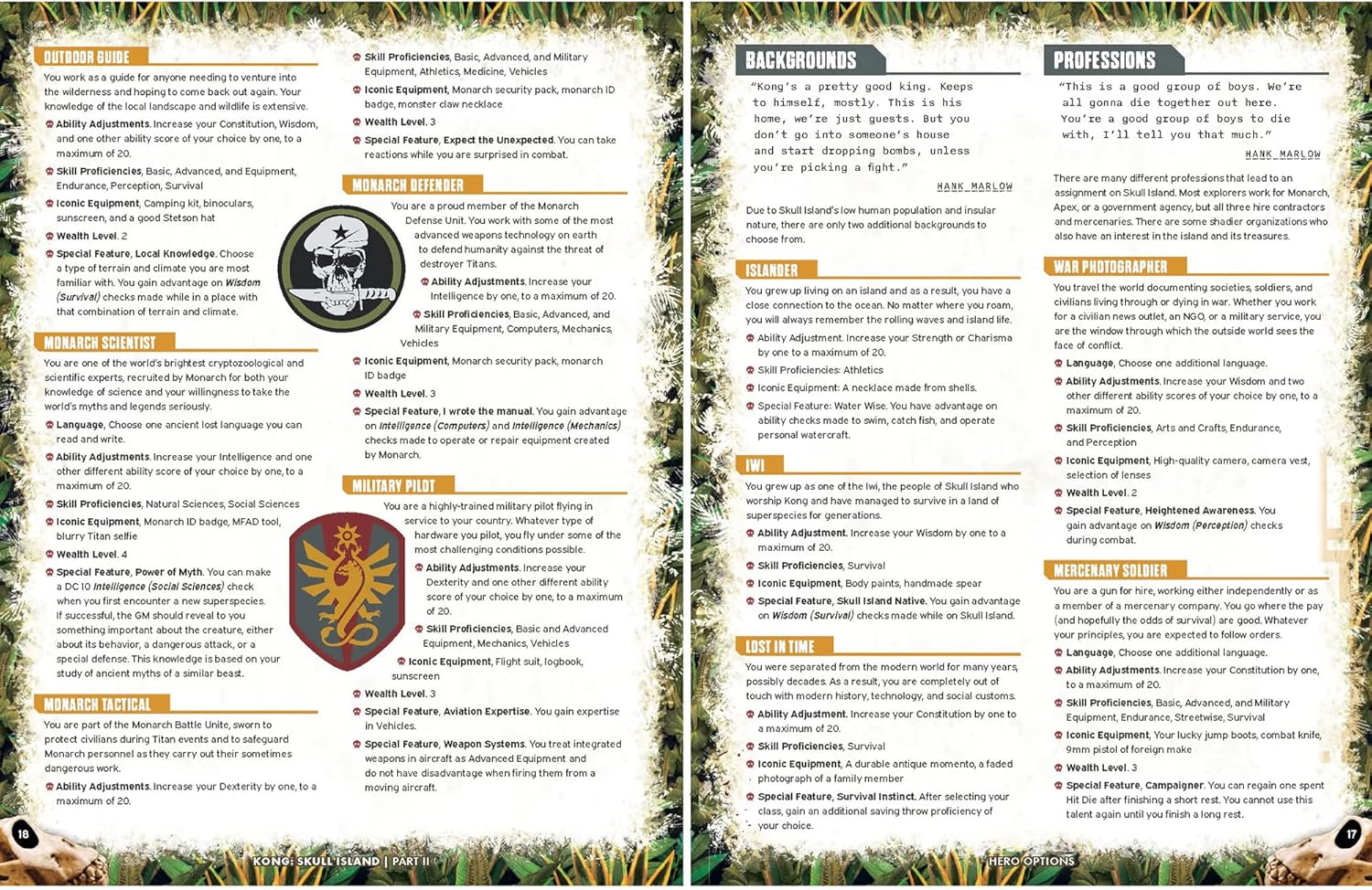 The highlights: Characteristics of the book of 128 Pages New Class: The Monster Hunter. New professions: mercenary soldier. New monsters: Titans and Superspecies. Kong: Skull Island Adventure – Sliver of the Skull.