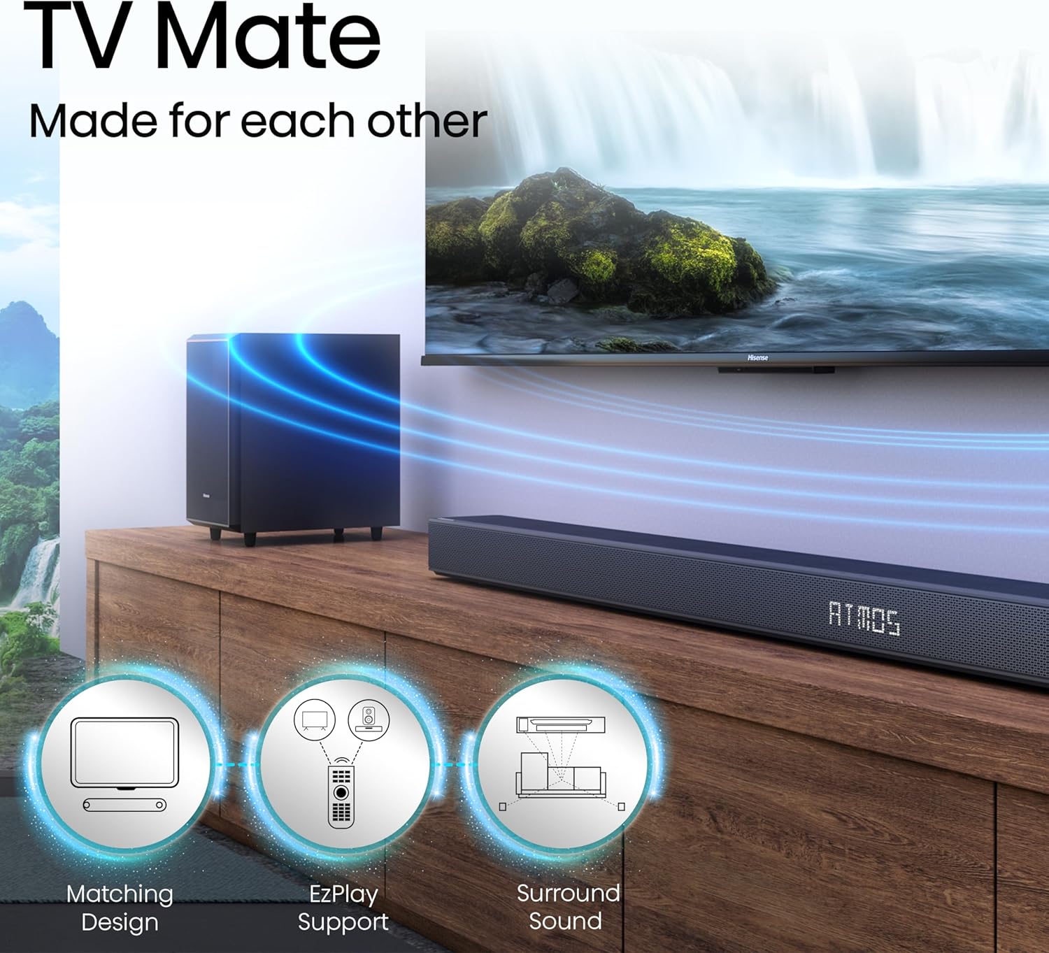 Easy Connectivity: With HDMI (eARC), the Hisense AX3125H can connect to your TV via a single HDMI cable (included), connect wirelessly via Bluetooth, and control both with one remote. You'll enjoy better TV sound in minutes.