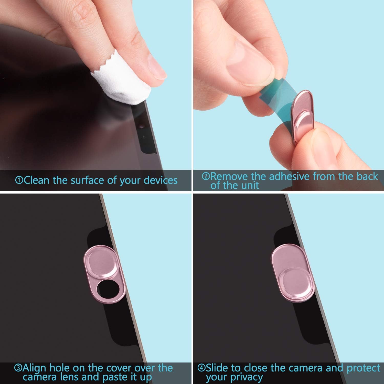 【Easy to use】 Simply align in your webcam, attach and press firmly for 15 seconds for a fort. The strong gel provides a lasting and reliable connection between its devices and the webcam cover. In addition, the adhesive can be easily applied and eliminated from the device without leaving any trace.
