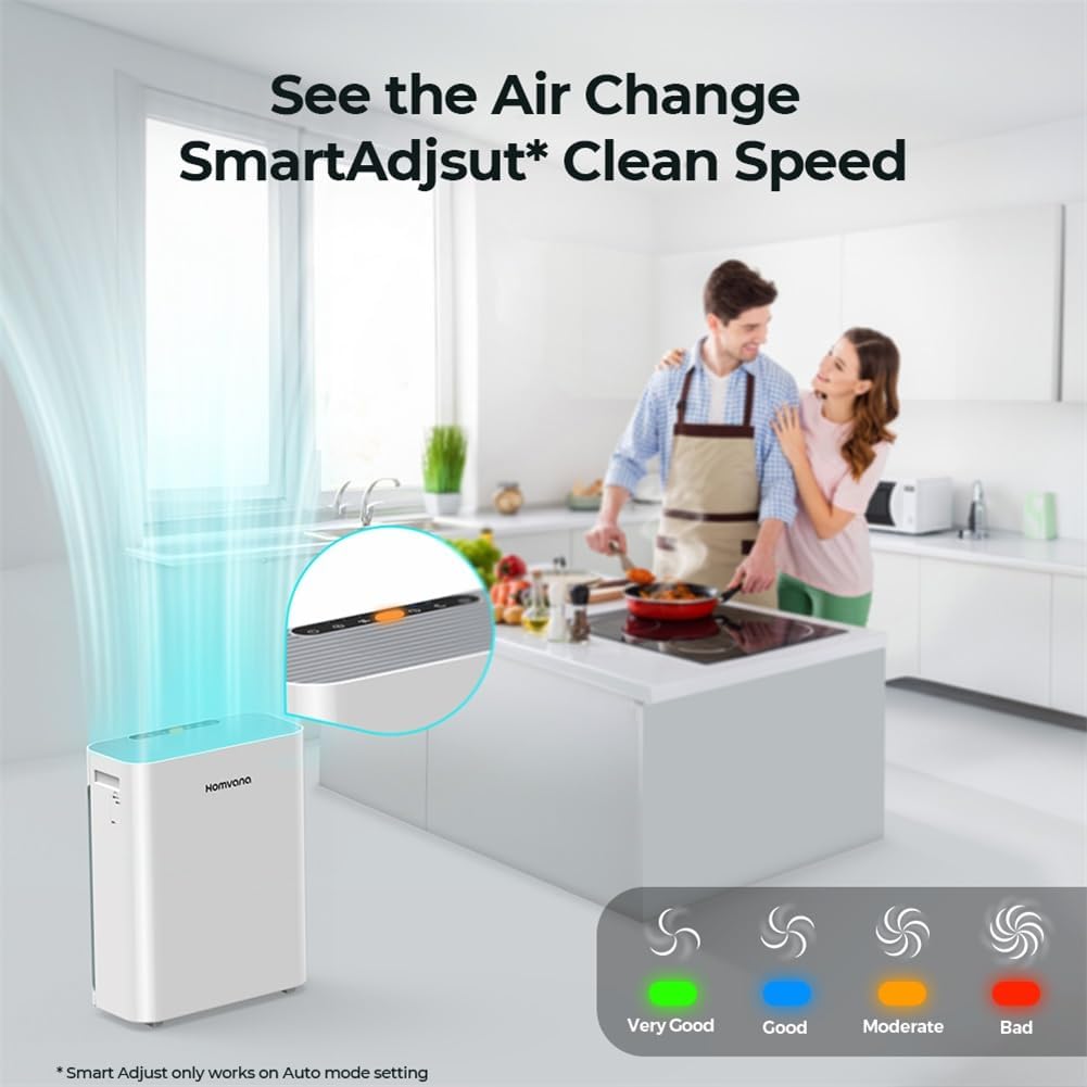 ✅【See invisible air quality through the app or indicator】With the help of the advanced infrared sensor, you can see the air quality in real time and how the air improves through the various indicators or the Homvana app. Like Green (Very Good), Blue (Good), Orange (Moderate), Red (Bad), no more questions or guessing; You are the owner of your air.