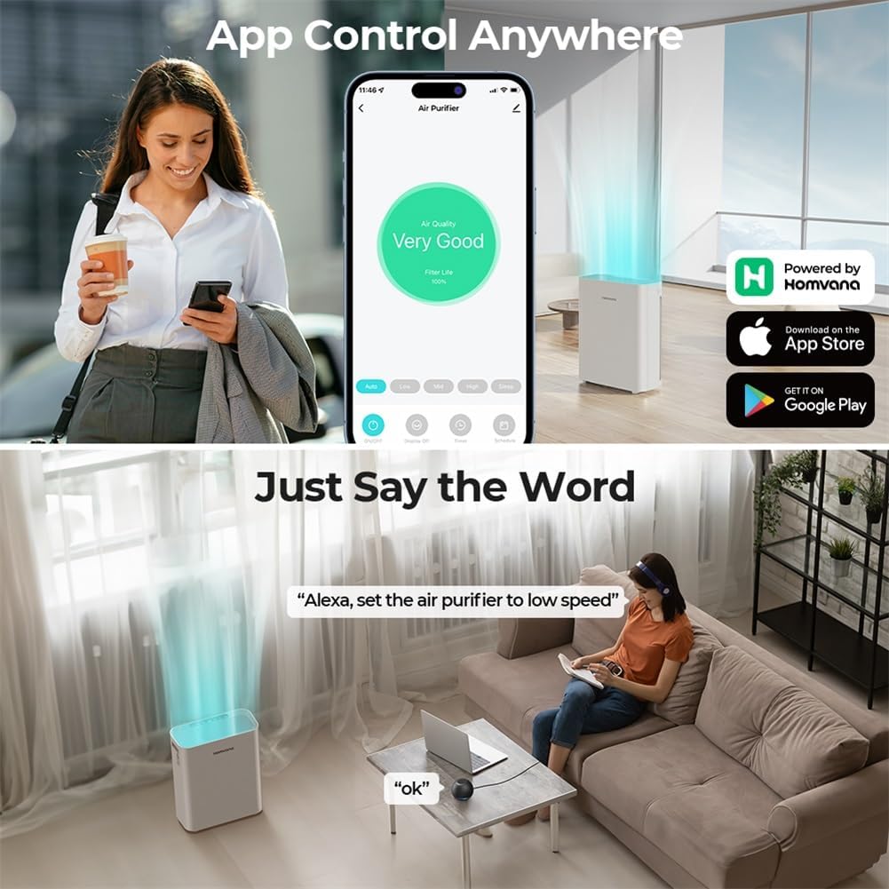 ✅【Easy-to-Use Smart App】With the free updated Homvana app, especially for its powerful system and concise user interface, you can easily monitor and manage your smart air purifier anytime, anywhere. About to return home? Simply set it on the road and walk into your home with clean, healthy air falling over you.