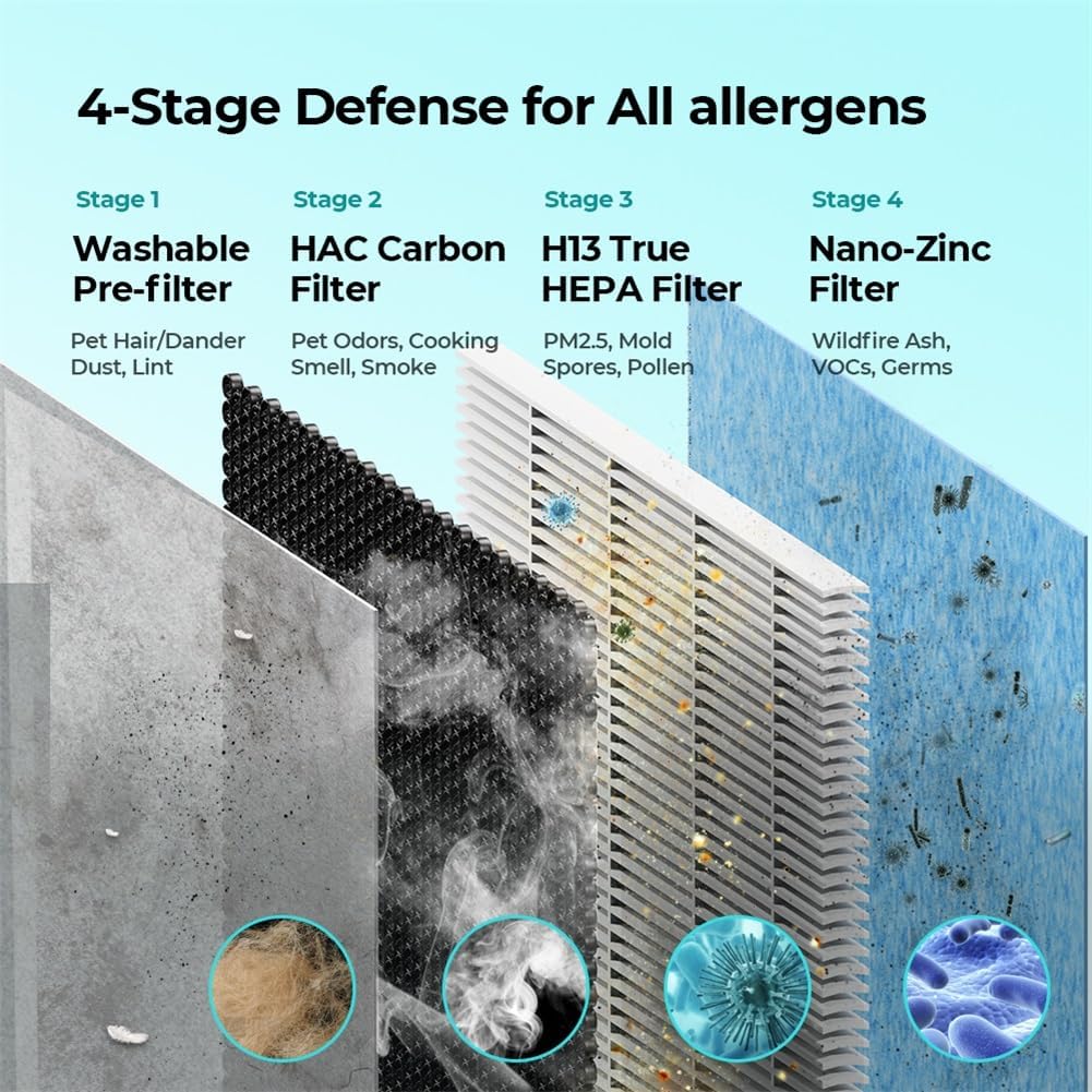 ✅【4-Stage H13 True HEPA Filter, Goodbye Allergy and Asthma】High-efficiency 4-stage filtration helps people with asthma and allergies. Includes H13 True HEPA filter, which captures 99.97% of 0.1 micron airborne contaminants such as dust, pollen, smoke and pet dander, etc. No more discomfort and discomfort during allergy and wildfire seasons. Search “B09R1GHVKF” on Amazon to purchase official filters.