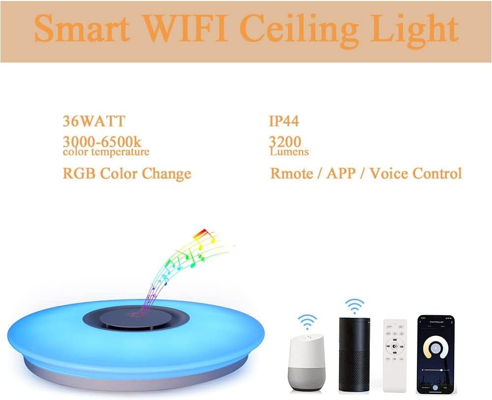 【Voice Control and Remote Control】After connecting Alexa and Hey Google, you can voice control the smart ceiling lamp to turn the light on and off, adjust the brightness and even change the light color. The connection only supports 2.4GHz WIFI. You can also easily control the ceiling light through the 2.4G remote control, or you can control it through the outdoor APP, which is very convenient.
