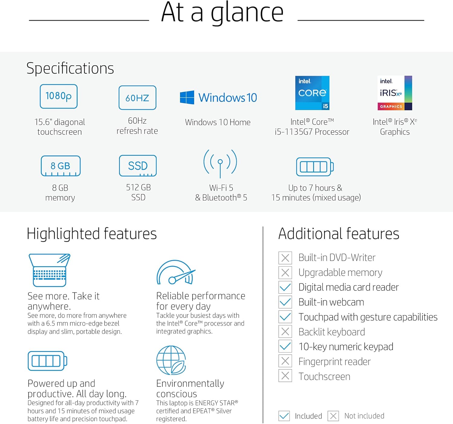 Processor: 11th Gen Intel Core i5-1135G7 (up to 4.2GHz with Intel Turbo Boost Technology, 8MB L3 cache, 4 cores)
