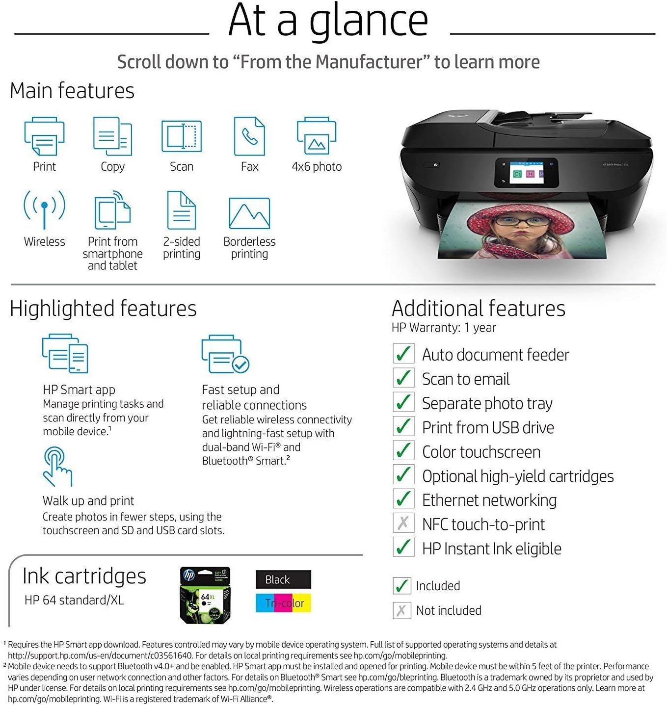 Reasons why the printer should consider all in one HP Envy Photo 7855 (renewed) designed to help you be creative, stay productive and save time, the HP Envy 7855 Wireless All-in-one is very suitable for home and office . USE.PRINTER SPECSCOPY, SCAN, Automatic Be-Side and Wireless Printing. Technology: HP thermal ink jet. Print speed: black (ISO): up to 14 ppm; Color (ISO): up to 9 ppm first page in black: as fast as 18 seconds; First page exit: as fast as 22 seconds; Black (draft): up to 22 ppm; Color (draft): up to 21 ppm. Work cycle: Monthly, letter: up to 1000 innovation: HP Envy 7855 prints photos without borders directly to the edge of the paper. Product dimensions (w x d x h): minimum: 18.26 x 15.35 x 9.0 in; Maximum: 18.26 x 20.39 x 9.0 Insupported paper sizes: letter, legal, 4×6 in, 5×7 in, 8×10 in, no. 10 envelopes. Rest: administer its impression, copy and scan the works directly from its envy 7855 with the 2.65 -inch printers of 2.65 inches, the LED touch screen. ; HP 64 black ink cartridges (~ 230+ pages); HP 64 Tricolor ink cartridges (~ 145+ pages); Power Cord. Apart from reconditioned printers, this renewed product has been tested and certified to work and seem new, with a minimum or null signs of wear, by a specialized velot seller approved. The product is backed by a 90 -day warranty and can reach a Brown generic box.