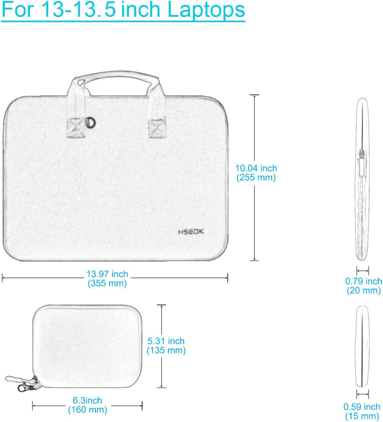 Dimensions and Materials: The main sleeve of the 14 -inch laptop computer is: 13.4 x 9.4 x 0.8 inches; The small box: 5.71 x 0.59 x 5.12 inches; 14 -inch laptop sleeve with elastic neoprene fabric and spongy fleece fabric lining, soft and good in contact