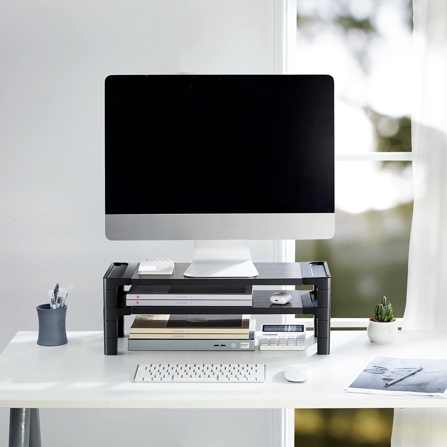Multifunctional desktop storage: The computer elevator is designed with storage pockets embedded on the sides of each platform. The built -in areas are perfect for small items that include pen, pencils and other accessories.