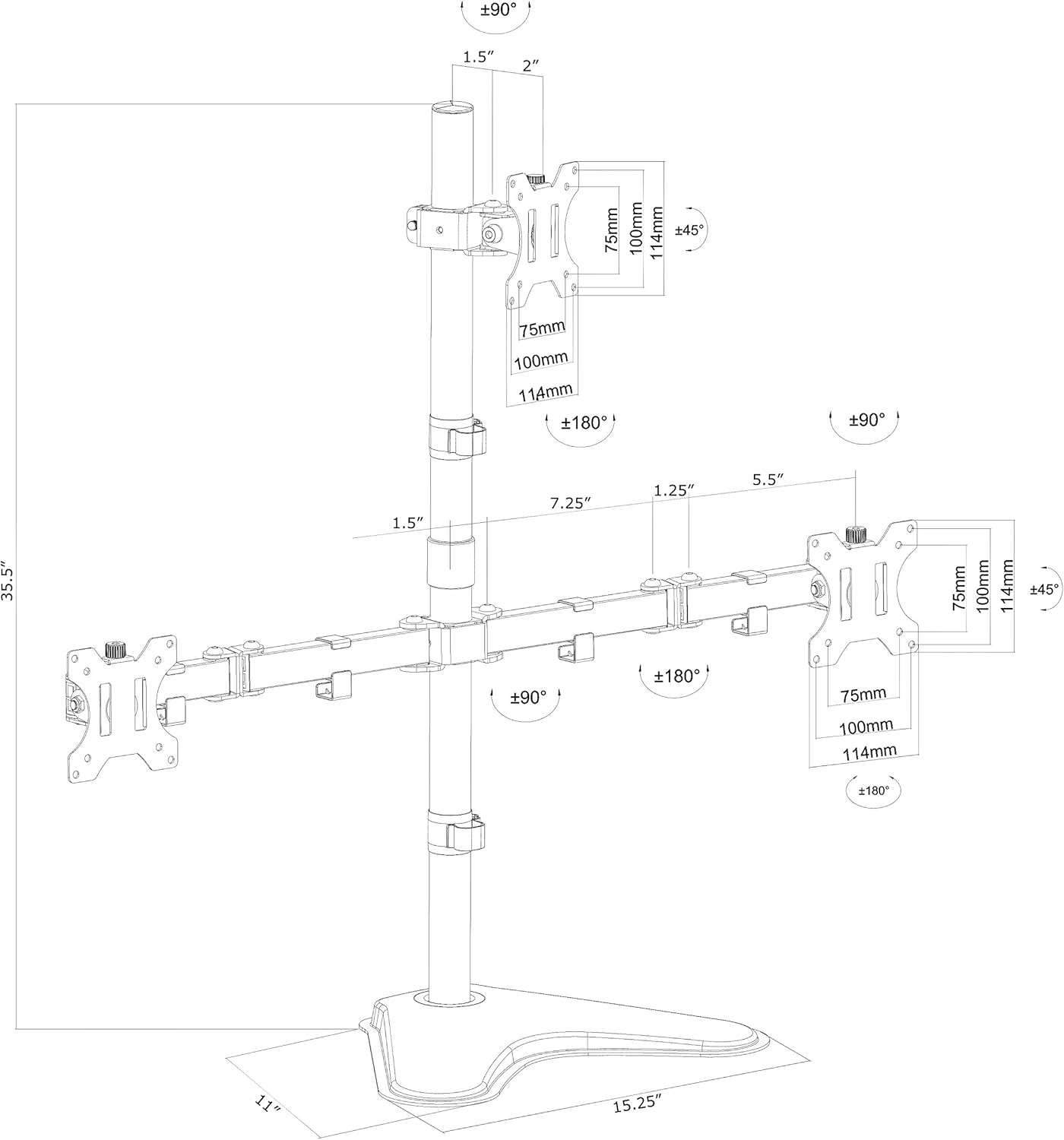 The 15.75 “x 11” steel base provides excellent stability for its monitors. The screens must be maintained within the center of gravity of the support to avoid inflection.