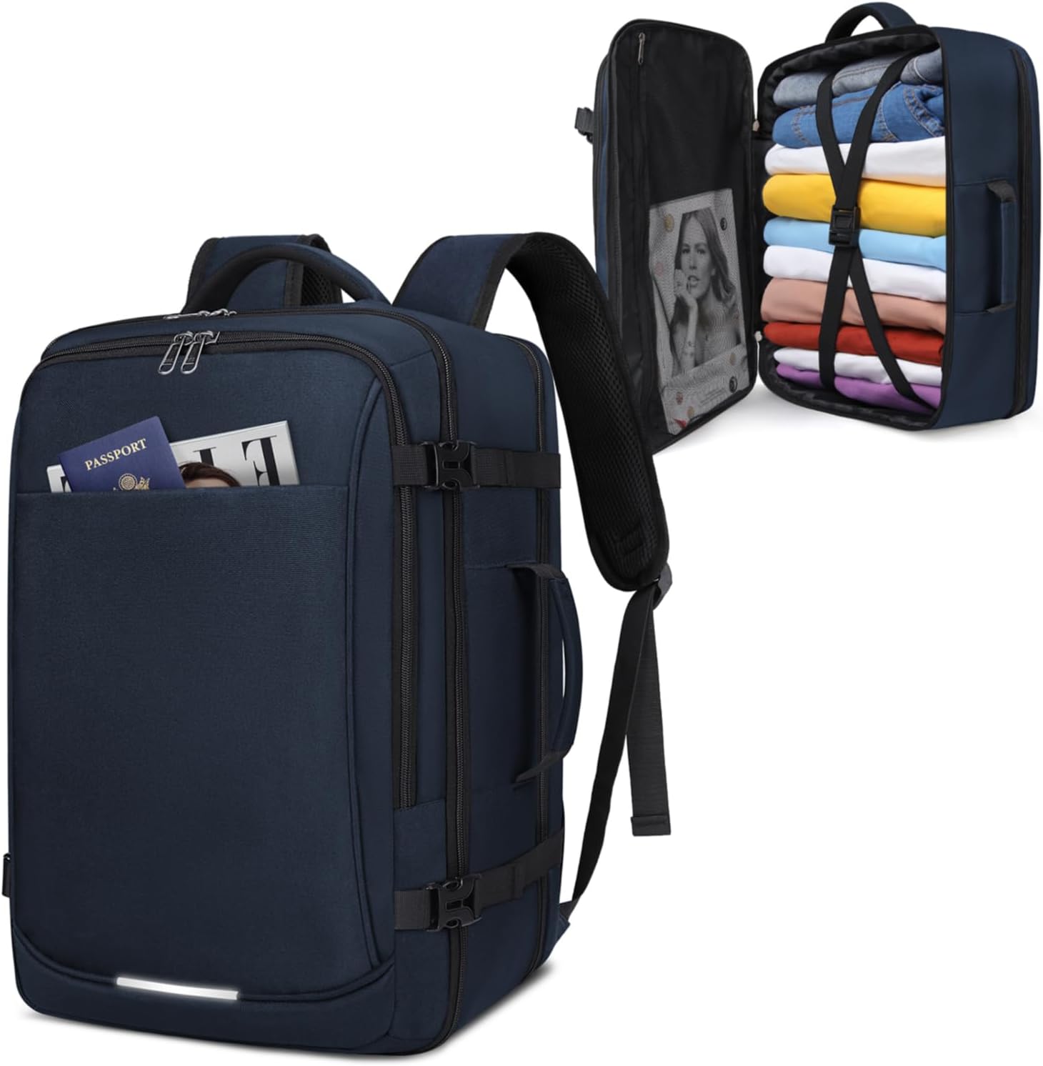 AMPLE SPACE: With 4 main compartments and 1 elastic water bottle pocket, this large travel backpack can fit a week's worth of clothes, shoes, books, toiletries, water bottle and your 17.3 inch laptop etc, making your travel items well organized. SURPRISE DESIGNS: Compared with other backpacks, this carry-on backpack is equipped with a waterproof drawstring shoe bag where you can easily carry a change of shoes. Moreover, a zipper pocket is also designed on the back of the backpack to completely hide 2 shoulder straps. COMFORTABLE EXPERIENCE: Breathable and soft well-padded back and wide comfortable mesh sponge shoulder straps for air convection, ventilation and heat elimination, effectively reduce the strain on your shoulder. IDEAL GIFT: The travel laptop backpack will be a good choice for families, lovers, friends and yourself on Christmas, Valentine's Day, birthday, anniversary or other festivals.