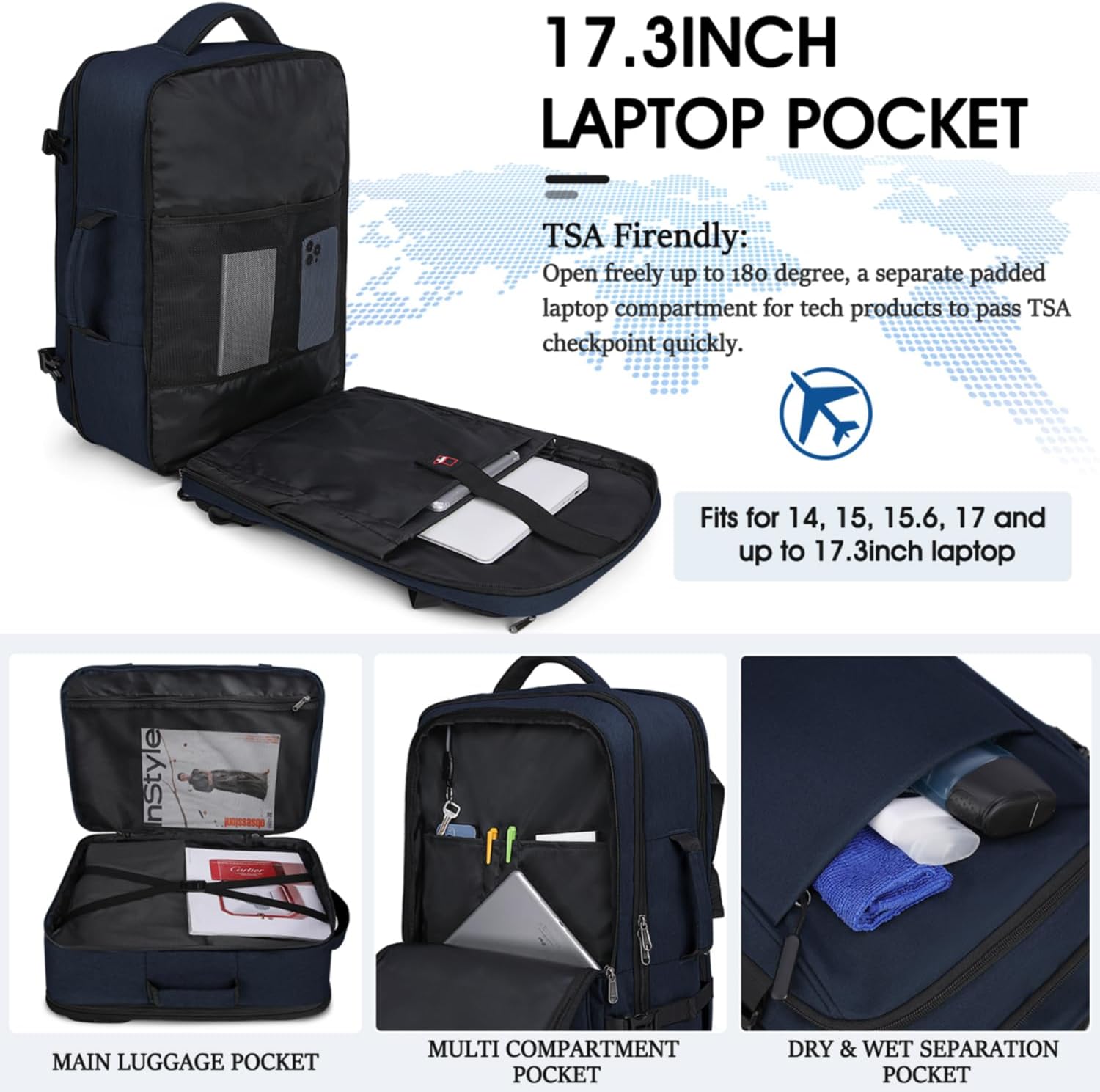 【Large Capacity Travel Backpack】Opens freely up to 180 degrees, a separate padded 17.3 inch laptop compartment for tech products to pass TSA checkpoint quickly. One spacious main luggage compartment for 5-8 clothes, books and many other items. One multi-functional storage pocket with 1 retractable key chain inside for paper, pens, passport, wallet, etc. Features high-density waterproof fabric, a front wet pocket for toiletries and wet items. One expandable side pocket for water bottle.