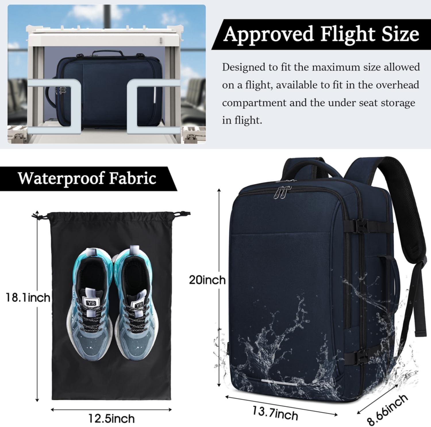 【Perfect Size for Flight Approved】Travel backpack: 13.7 x 8.66 x 20 inches (L x W x H). Shoe bag: 18.1 x 12.5 (L x W). Capacity: 40L. The carry-on backpack is ideal for air travel because it meets airline pack size requirements and fits perfectly in the overhead luggage compartment or under the airplane seat. Plus, you can board the plane using this laptop travel backpack as a personal item and save on paying additional baggage fees.