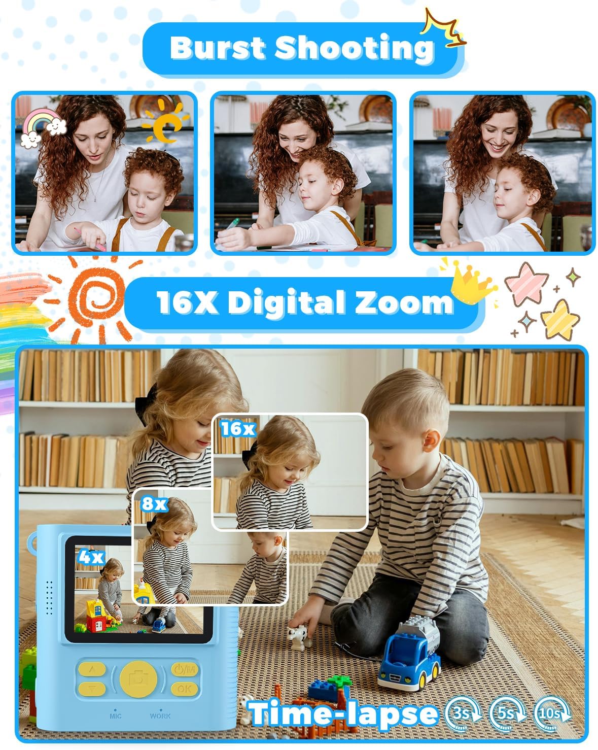 📷【 DIY coloring photos】 Children can choose different special effects filters, photo frames or special effects to take photos, and then use crayons to decorate and color printed photos, which can meet the different needs of children and bring unlimited creativity.
