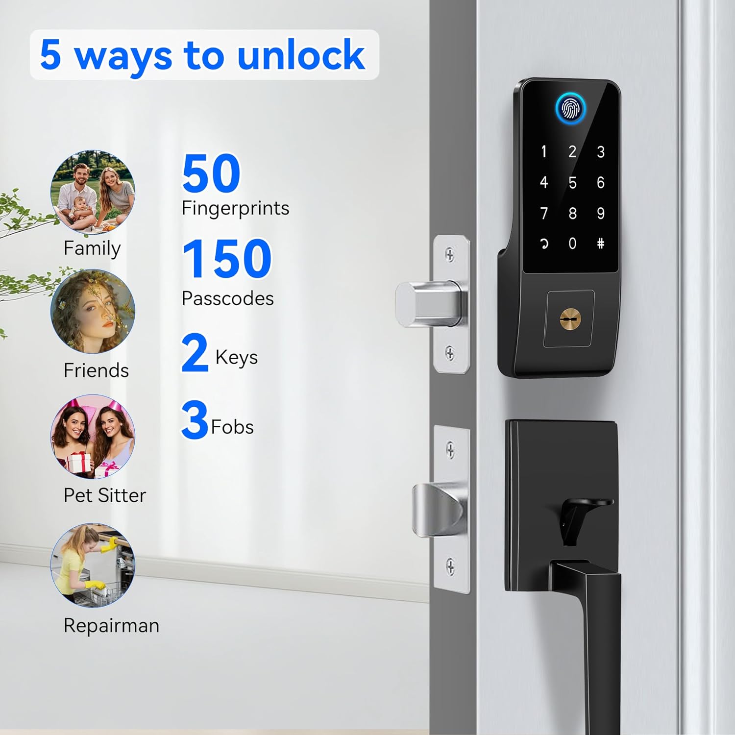 Smart door without key 5-EN-1: This smart door lock offers five convenient unlock options: footprint, code, key key, application and key), so it is never blocked. With this versatile set of locks on the front door, enjoy greater security and flexibility, perfect for effortless access and tranquility at home.