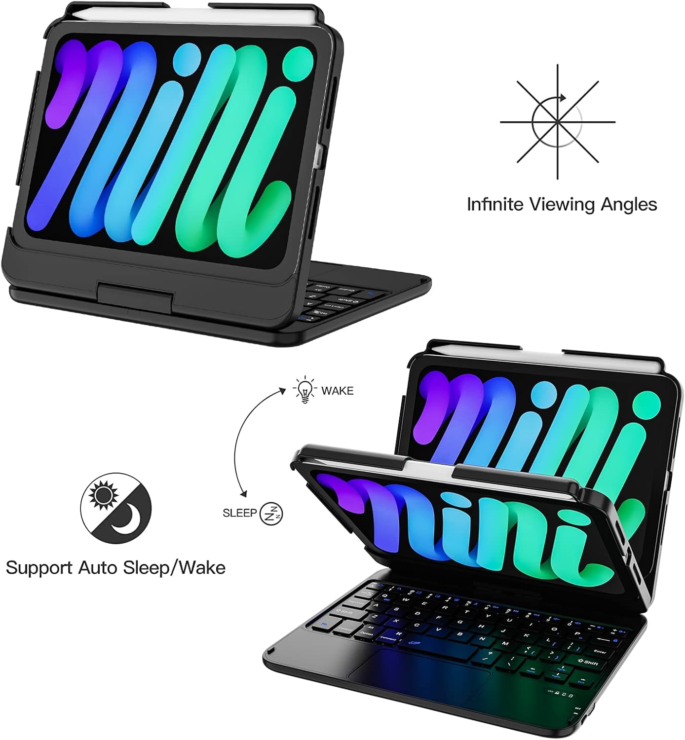 💻💻【Built-in Apple Pencil Holder & Auto Wake/Sleep Function】 – Our iPad Mini 6th Generation keyboard case comes with a slot to hold your Apple Pencil and can also support the magnetic attachment and wireless charging of the Apple Pencil. second generation without removing the (Apple Pencil is NOT included). Automatically turns your iPad on or off when it is opened or closed, saves a lot of power for your iPad.