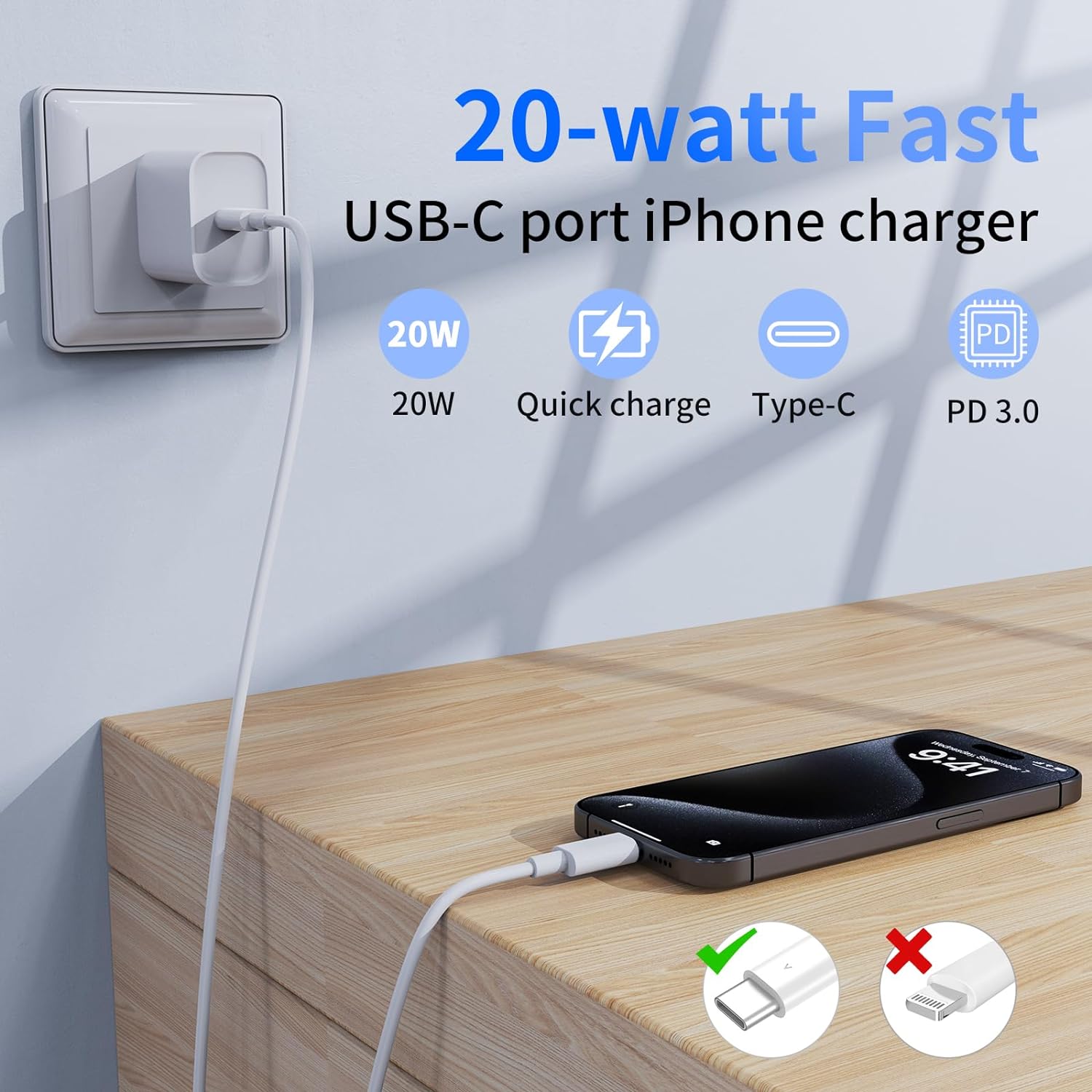 Perfect Combination and High Service: 2 x 20W iPhone 15 fast chargers, 2 x 6ft iPhone 15 chargers, Type C charging cable. Lightweight, space-saving and convenient to store in bags and pockets. The input of this USB C power adapter is ideal for worldwide travel, which is the optimal choice for charging your phone. Worry-free refund and replacement for 365 days. If you have any questions, please feel free to contact us. We promise to solve your problems within 24 hours.