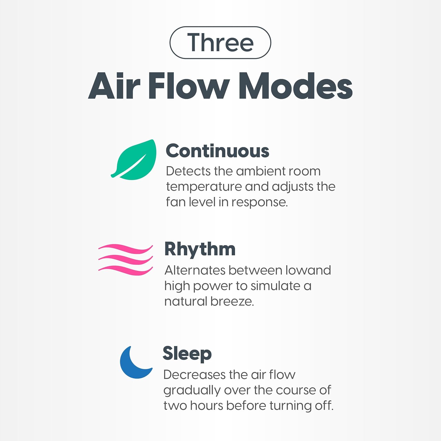 3 Modes: The three fan modes (manual, rhythm and sleep) versatile options to meet their cooling needs, whether a natural breeze emulation or a soft night.