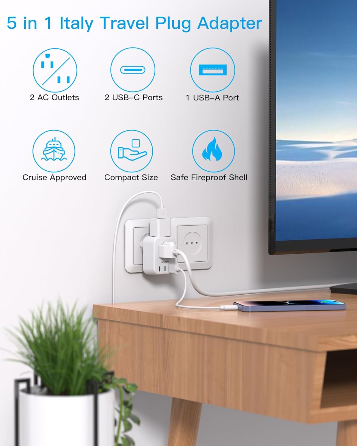 【5 in 1 Italian Power Adapter】- Italian plug adapter provides 2 standard US outlets, maximum capacity up to 2500 watts (max 250 volts, 10A); 3 USB ports can charge up to 3.1A, allowing you to charge 5 devices simultaneously. Ideal for cell phones, tablets, power banks and other electric chargers, ideal for cell phones, laptops, cameras, power banks, etc.