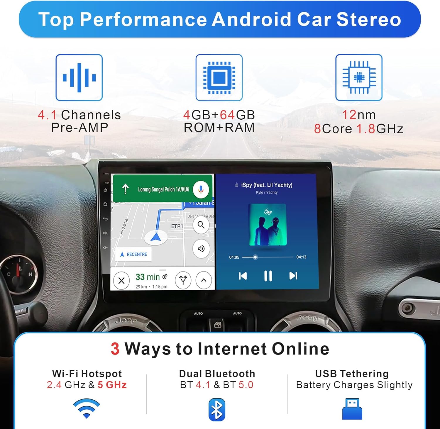 【Android 10.0 car stereo system of 8 nuclei】 The Android 10.0 automobile radio with high resolution 1280*720 10.1 inches of Tactile screen QLED and CPU octa core with 4 GB of RAM and 64gb Rom would offer you a faster and more soft experience. This head bridge is for Jeep Wrangler 2015, 2016, 2017.