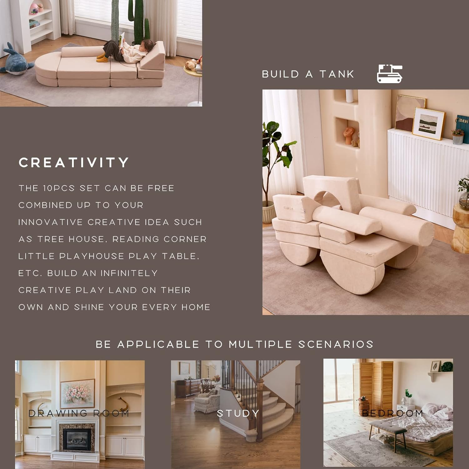 Unleash childish creativity: the 14PCS set can be free combined with its innovative creative idea, such as Tree House, Reading Corner, Little Playhouse, Play Table, etc. Build an infinitely creative play land on your own and shine all your interiors in the home!