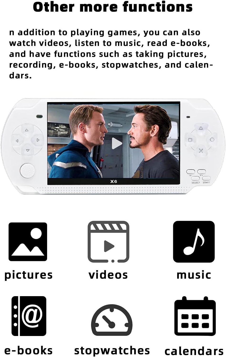 ※More entertainment functions※. It is not just a game console. When you don't want to play games, you can also watch movies, electronic music and e-books. It also has recording, e-book, stopwatch, calendar and other functions.