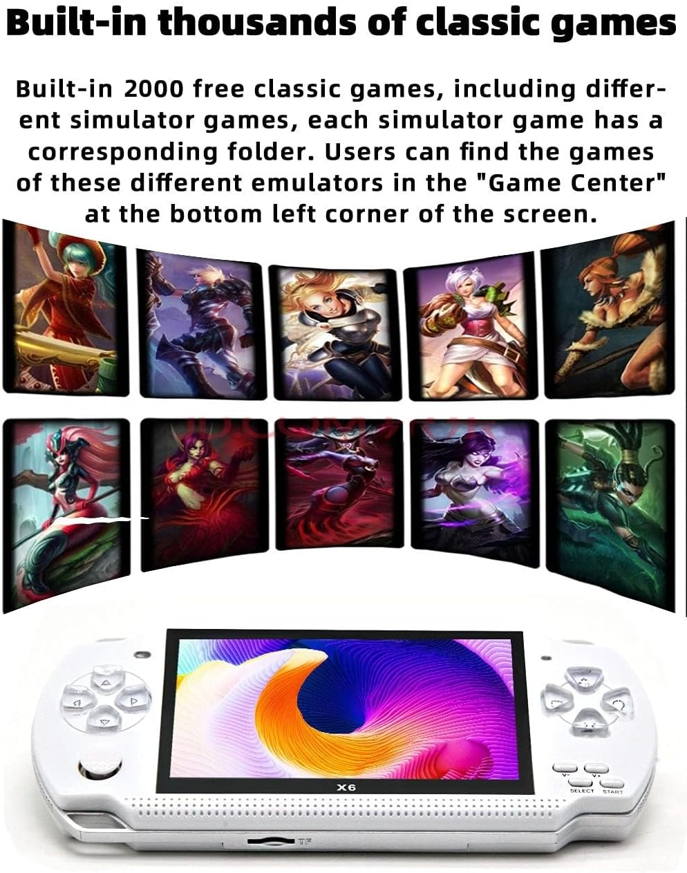 4.3″ LCD screen, screen resolution: 480*272; Built-in 8GB memory; Maximum support 64GB mini TF card; Support multiple simulators (GBA/GBC/GB/FC/SFC/MD/SEGA games); Language: Multiple (English, Japanese, Korean, Spanish, Portuguese, Russian, Italian, French, German) Power & Battery: Rechargeable battery; Game features: 8-64 the following games, online games; Video: Support AVI, WMV, FLV, RM, RMVB, MP4, 3GP, MPEG, VOB, DAT, SWF format.; Music: Support WMA, DRM WMA, OGG, APE, FLAC, WAV, AAC format.; Other functions: E-book, Stopwatch, Calculator, Calendar.