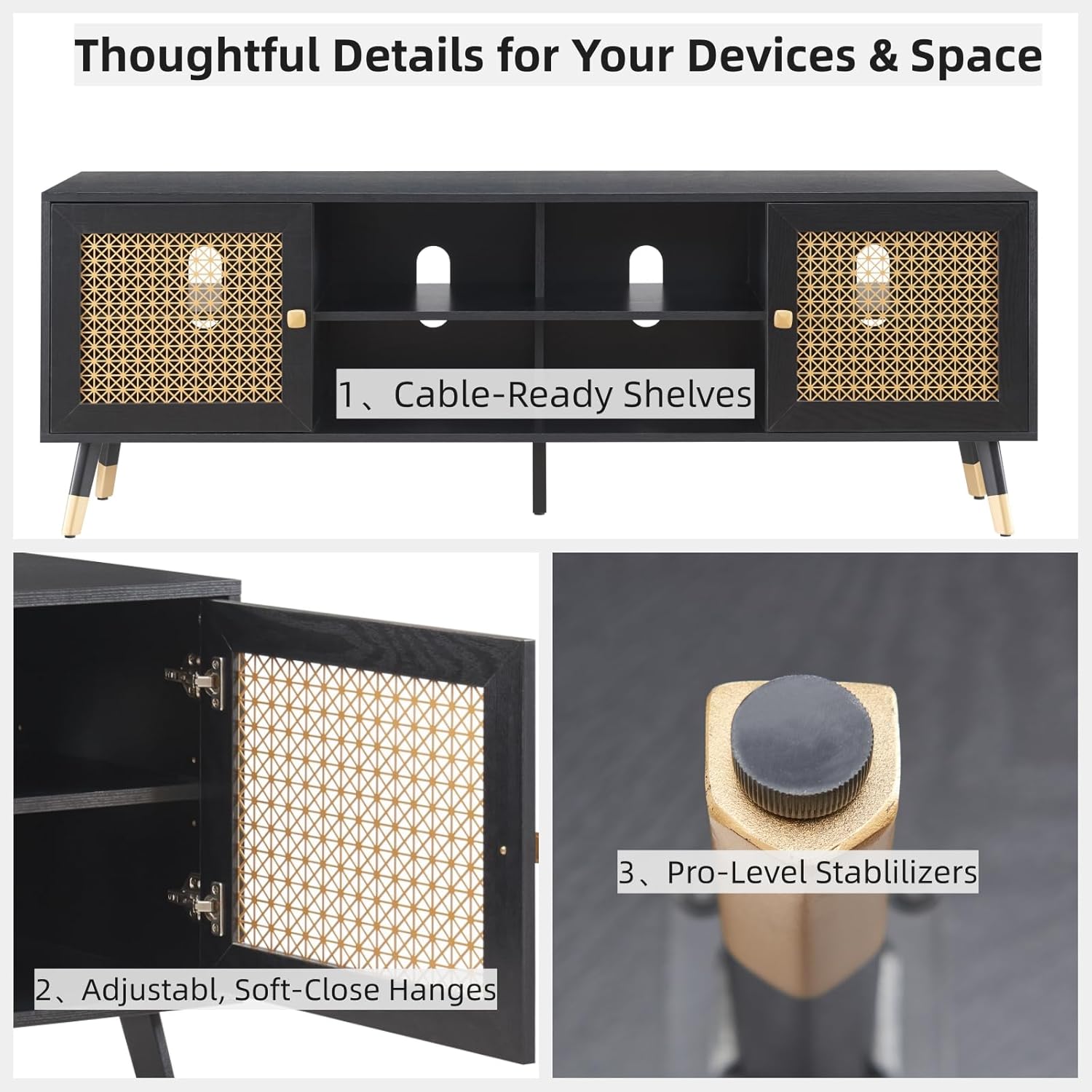 Attractive style: modern television supports from the mid -century combine fashion metal elements with a vintage wood appearance. Its striking doors of golden metal mesh and elegant handles add a unique charm to the furniture in their living room. This TV console is perfect for a variety of decoration styles.
