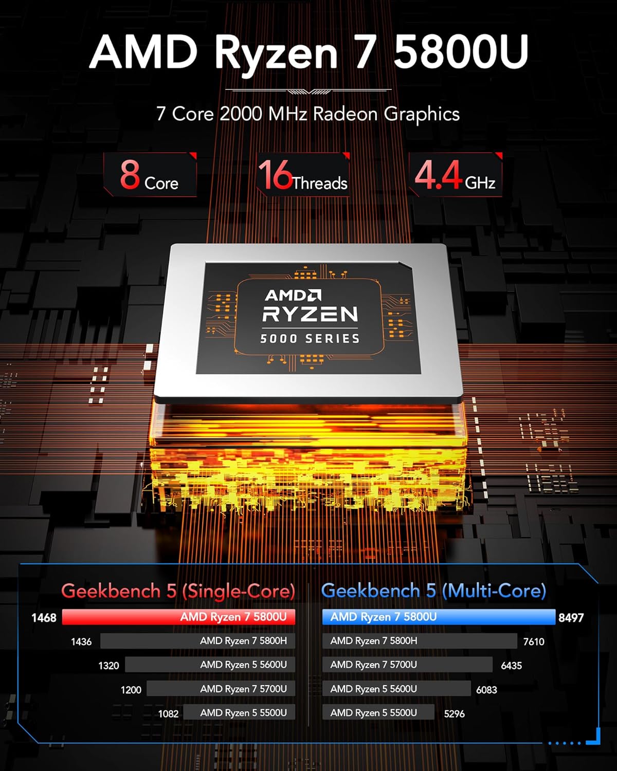 【AMD Ryzen 7 5800U Processor Gaming PC】Upgrade your productivity and gaming with KAMRUI AM06PRO mini gaming PC. KAMRUI AM06PRO mini gaming PC is equipped with high-performance AMD Ryzen 7 5800U CPU (8 cores, 16 threads, up to 4.4GHz, 16MB L3 cache). Compared with Ryzen 7 5700U, Ryzen 5 5600U, 5500U and Intel Core i7-1165G7, Ryzen 7 5800U mini PC delivers better multi-threading performance, delivering improved performance in multi-tasking and multi-threaded applications. With integrated AMD Radeon RX Vega 8 graphics running at 2000MHz, it is perfect for creative software like Photoshop (PS), Premiere Pro (PR), Illustrator (AI).