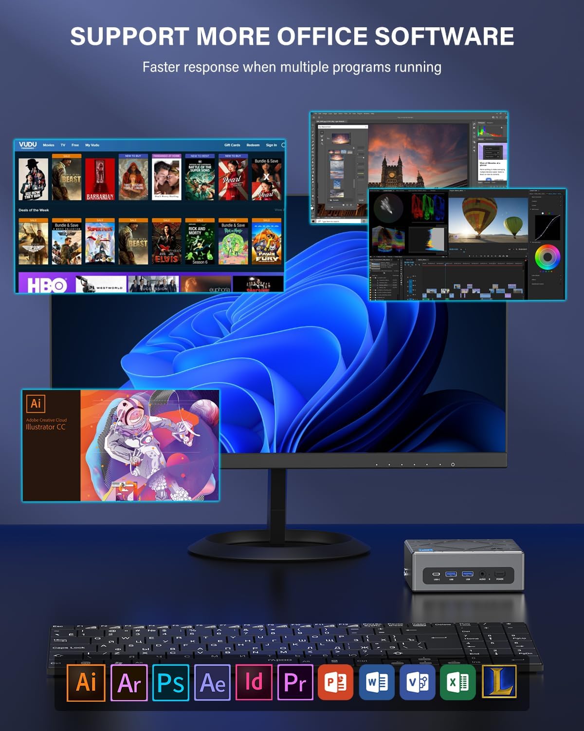 🔃【DUAL CHANNEL 32GB DDR4 + 512GB SSD UP TO 2TB】KAMRUI mini desktop computers are equipped with DUAL CHANNEL 16GB DDR4 RAM 3200MHz and 512GB M.2 2280 SATA SSD. 16+16 dual-channel RAM is 30% faster in reading and writing than single-channel 16GB RAM, enabling the micro pc to run multiple high-performance operations at the same time. Expandable HDD design is also offered, you can replace the SSD of your small pc to 2TB(max) or add a 2TB 2.5″ 2280 HDD/SSD (not included).