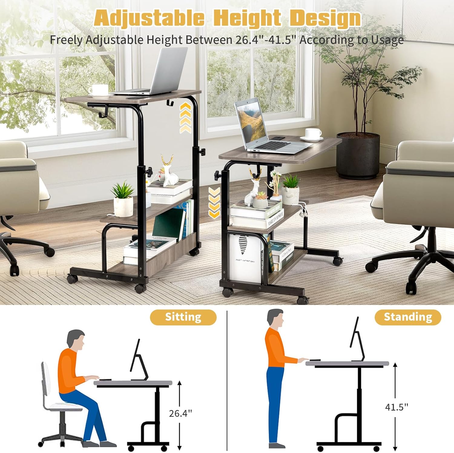 【Adjustable height, several scenes】: The adjustable portable desktop has an adjustable height of 26.4 “-41.5”, which can meet your needs, whether sitting or standing, and is more ergonomically designed. C -shaped design and the lower shelf ensure the stability of the table.