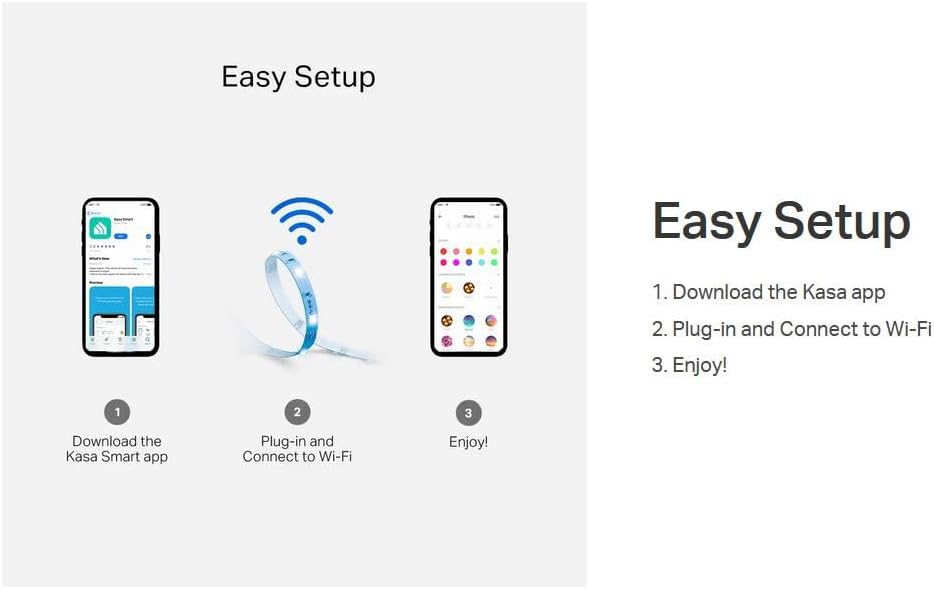 Paint your home with infinite colors with the Kasa Smart multicolor light strip. Transform your home into the ultimate entertainment destination with LED strip lights that feature 16 million colors with high brightness and saturation to suit every mood and scene, and take control of your light strip with just your voice or the Kasa app. Important information: This device complies with part 15 of the FCC rules. Operation is subject to the following two conditions: (1) This device may not cause harmful interference, and (2) This device must accept any interference received, including interference that may cause undesired operation.