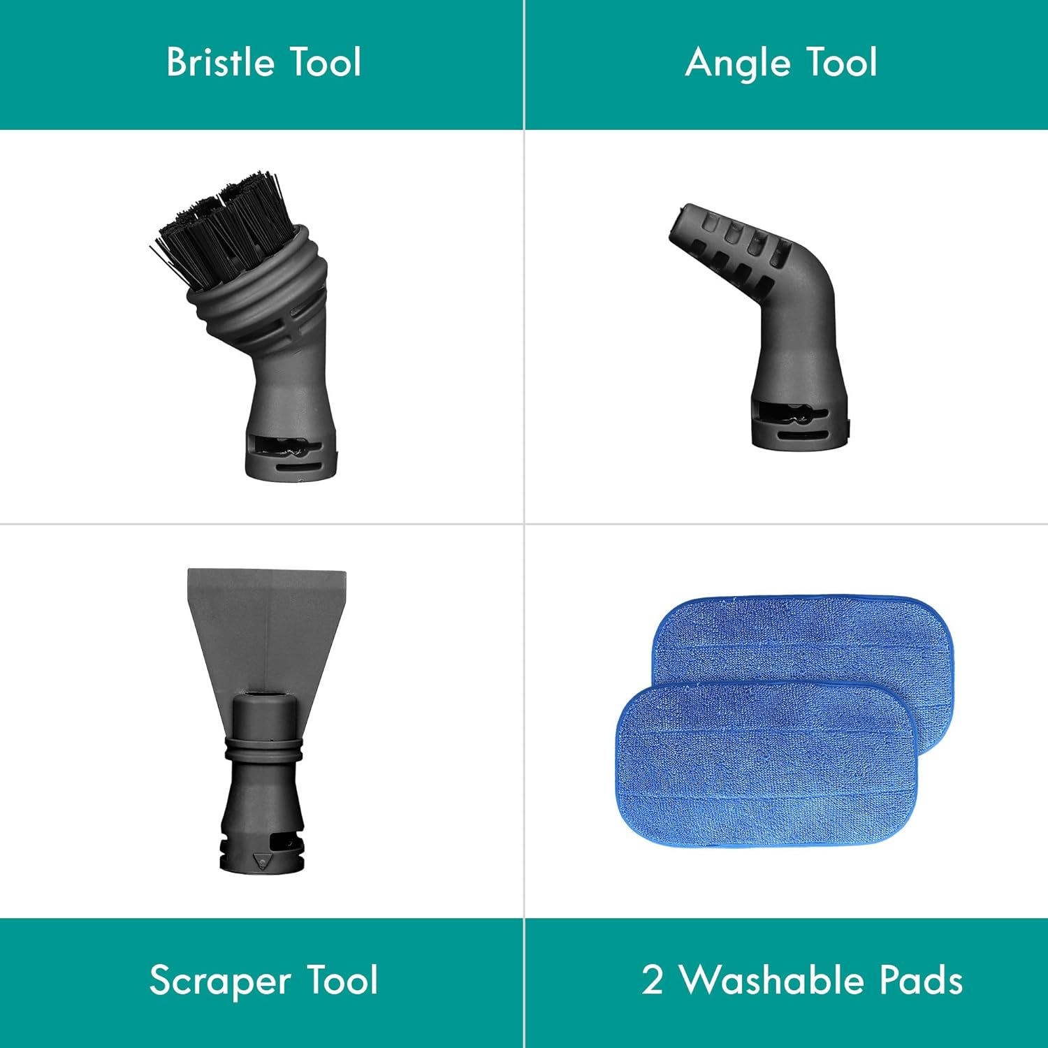 TOOLS INCLUDED: Includes a bristle tool, an angle tool, a scraper tool, two washable pads, a carpet slider and a water glass.
