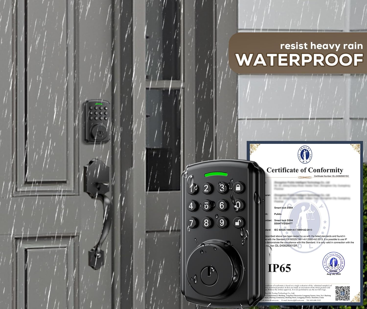 【IP65 VS IP54】 Most smart locks are only IP54 waterproof and can only be used for a short time under light rain. Once the water enters, they will stop working; Deadbolt locks are mainly used outdoors, IP65 can support a heavy rain and provide better protection;
