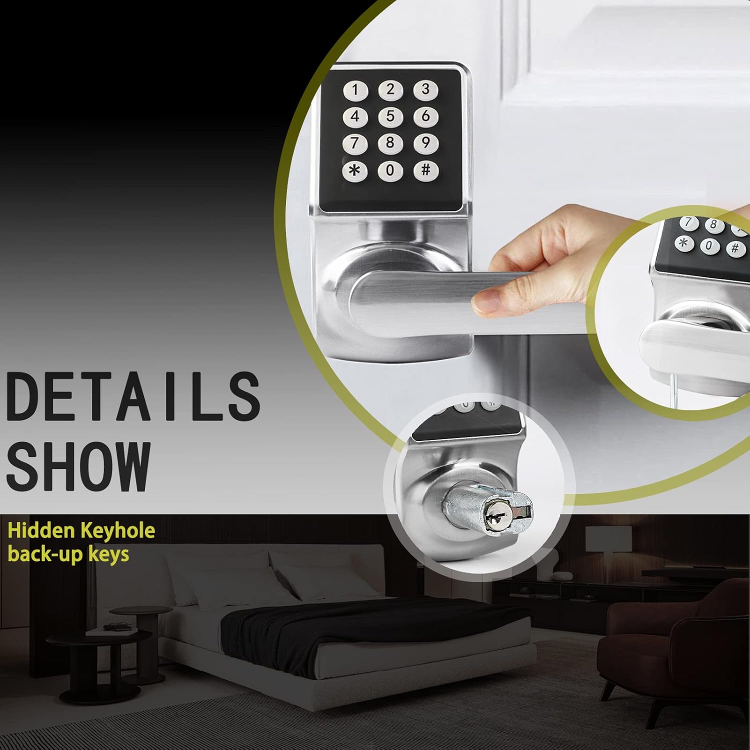 Keeping Home Safe: 3 in 1 Keyless Entry Digital Door Lock: Access Code + MIFARE M1 Card + Emergency Key, Smart Lock for Front Door. After someone enters the wrong passcode 6 times, this digital door lock will automatically lock for 1 minute and automatically lock. spy passcode support;