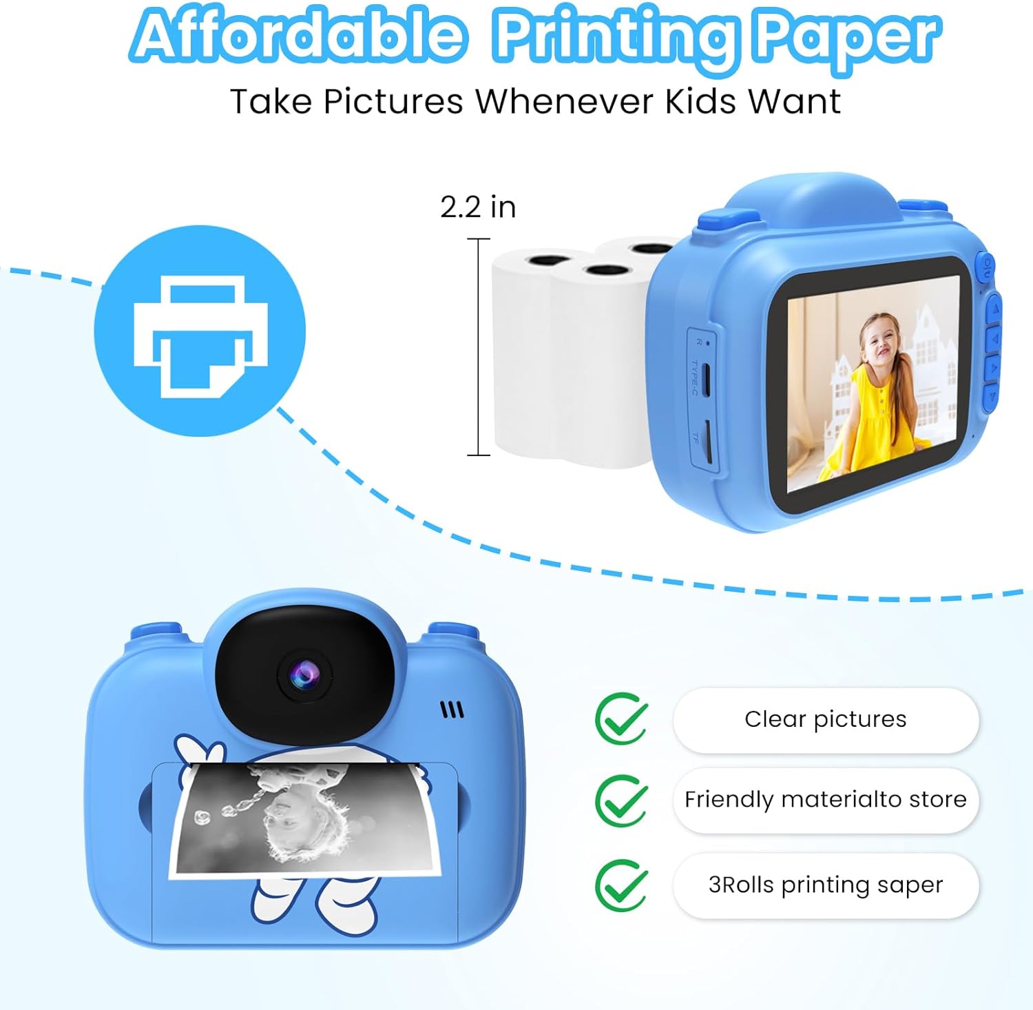 Affordable Printing Paper: The instant print camera adopts thermal printing technology, eliminates the need for ink or toner, making it safe for children to use. The kids camera instant print comes with 3 rolls of printing paper and the printing paper is not expensive. Parents don't have to worry about how many photos their child takes