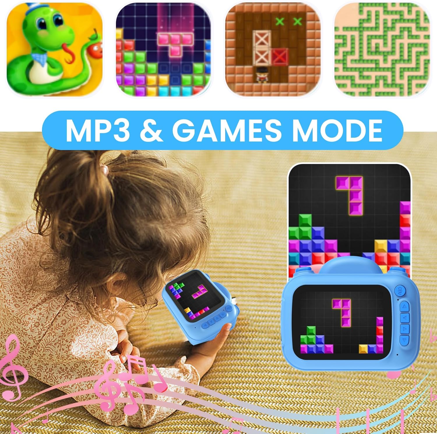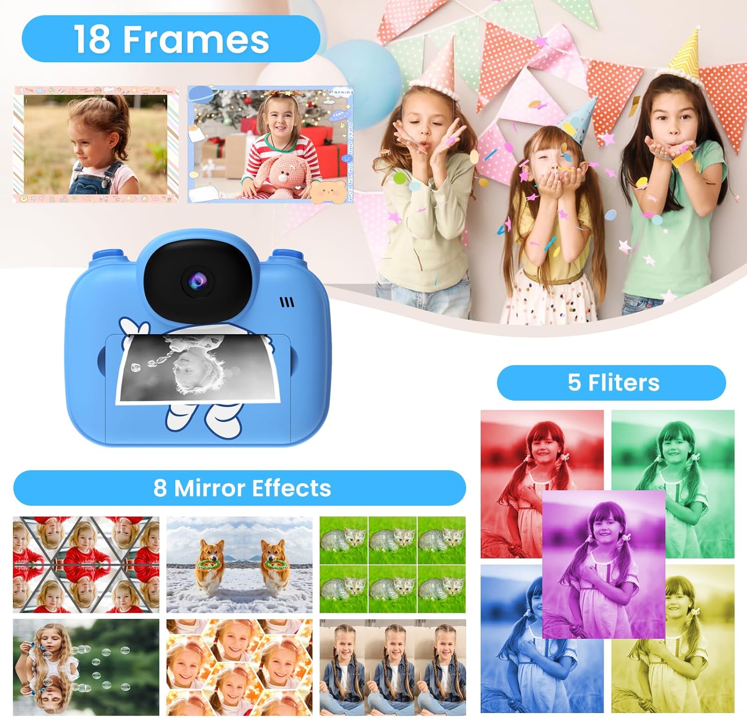 Interesting Multifunctional Camera: The kids instant camera has 5 filters, 8 mirror scenes, 18 stickers and photo frames. It's so much fun for kids when they take a photo or selfie. Plus, the kids camera comes with 5 mini-games to pass the time. This kids camera is multifunctional and easily converts to a digital camera, camcorder, or instant print camera.