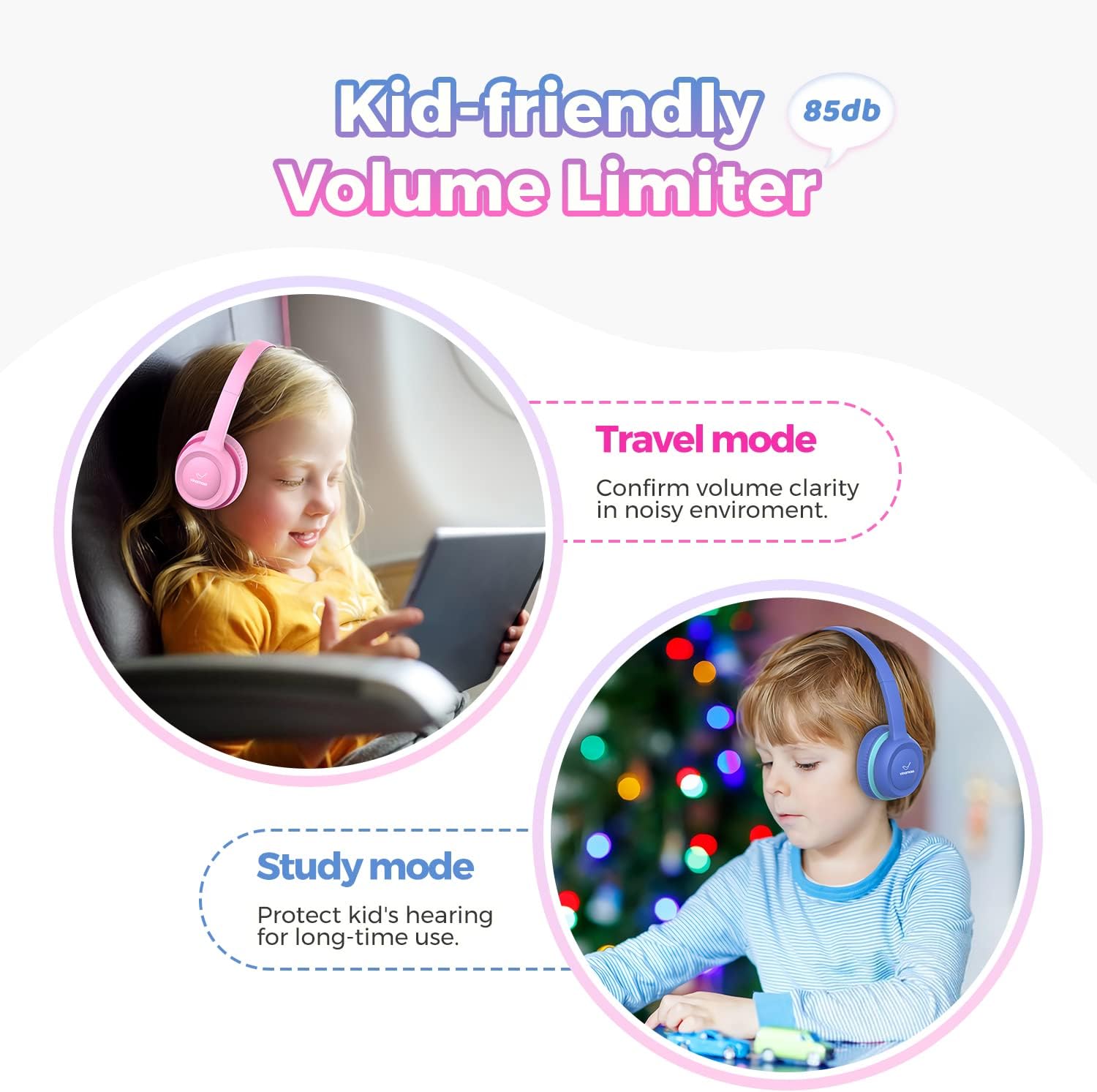 【Hearing Protection for Kids】: A63 kids headphones have built-in safe and fixed sound volume limitation levels set at 85 dB, which satisfy the WHO recommended limit level to prevent hearing damage. There is no need to worry about your children's hearing damage even without parental control and supervision. Parents can leave their children alone in the world of music with confidence. Help your children love what they listen to at a safe volume for different environments or tasks.