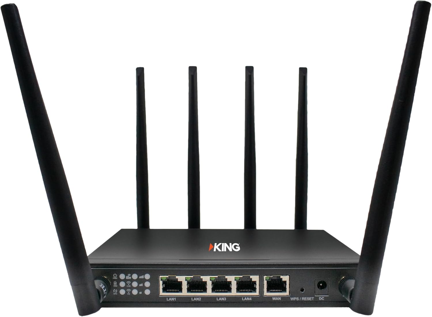 The KING Passport is a compact and versatile network router, perfect for travel and RVing. Its dual-band frequency and high-gain MIMO antennas enable fast data transfer speeds of up to 300Mbps and support for 32 devices. The router is equipped with an expandable physical SIM slot, allowing for added versatility and compatibility with multiple network providers. It features four 10M/100M/1000M RJ45 LAN Ethernet ports and one 10M/100M/1000M RJ45 WAN Ethernet port, providing flexible connectivity options. The Passport sports a sleek black metal design, measures 180 x 130 x 30mm, and weighs less than 1500g, making it easy to carry around. The device can be powered via any standard AC power outlet and consumes a maximum of 7W in the on state and 0.5W in the off state. The Passport also includes several LED indicators for power, VSIM, LTE, Wi-Fi, SIM, signal, and WAN/LAN status.