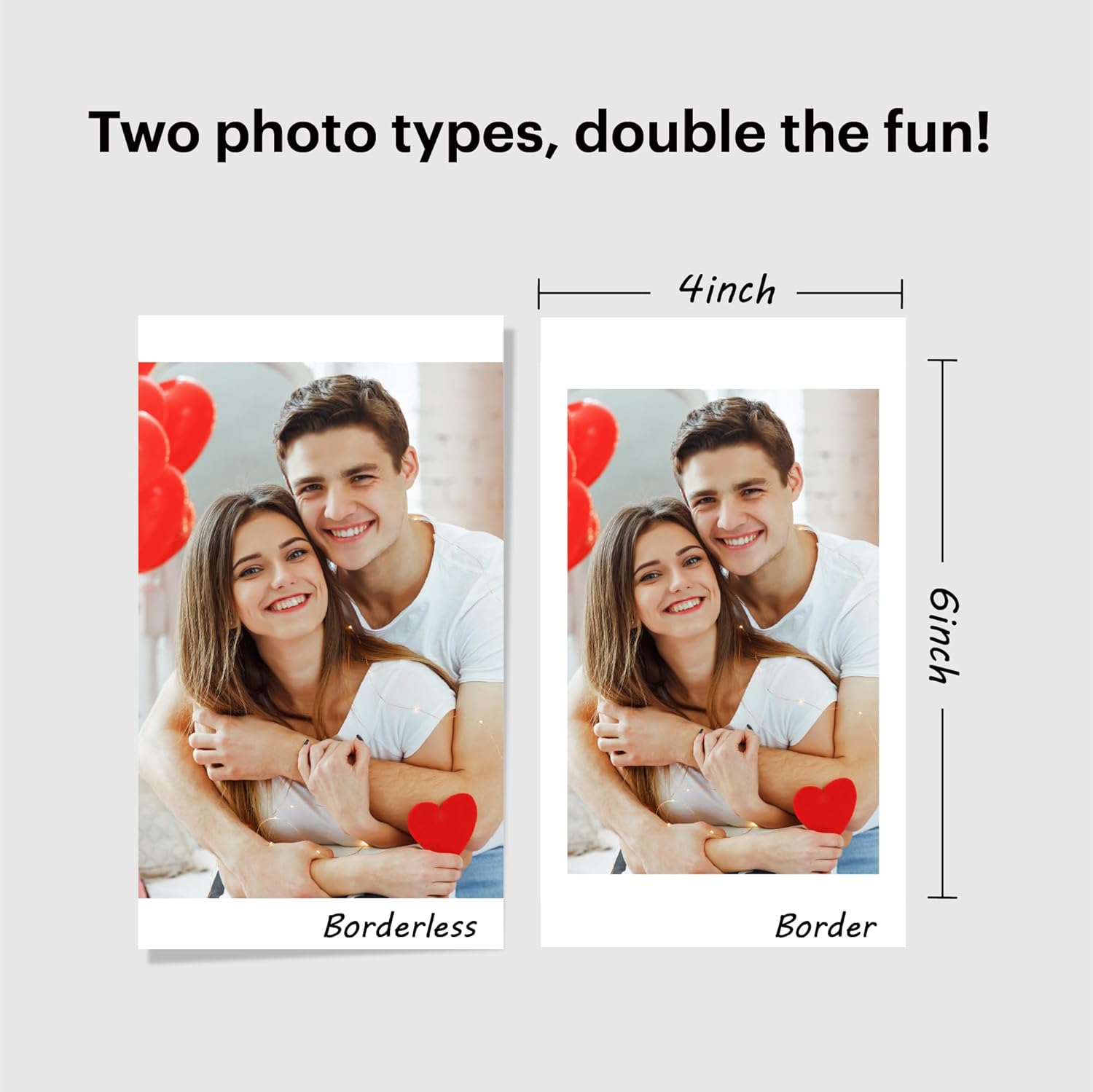 Two types of photos: You can choose between bordered and borderless photos. Write your memories on the bordered photo type to make them last forever. If you prefer larger photos, you can print them as borderless photos!