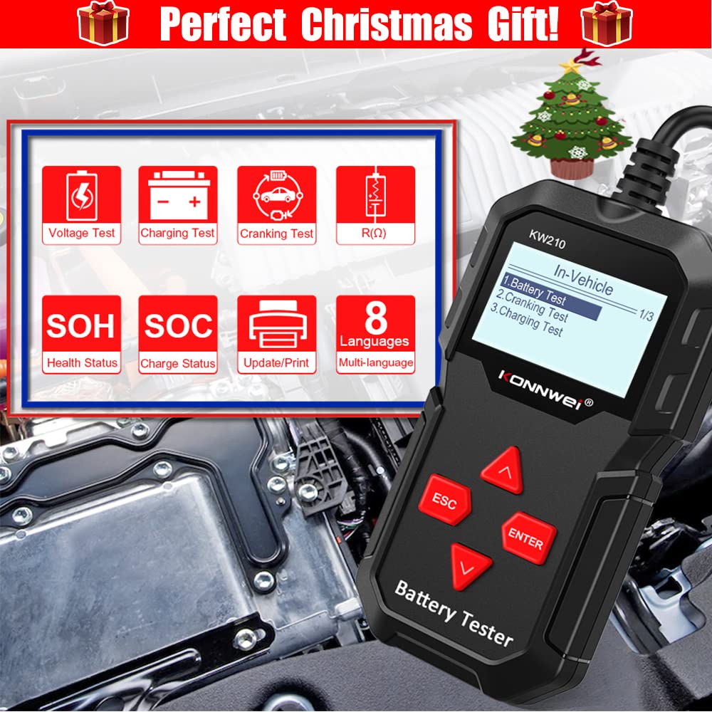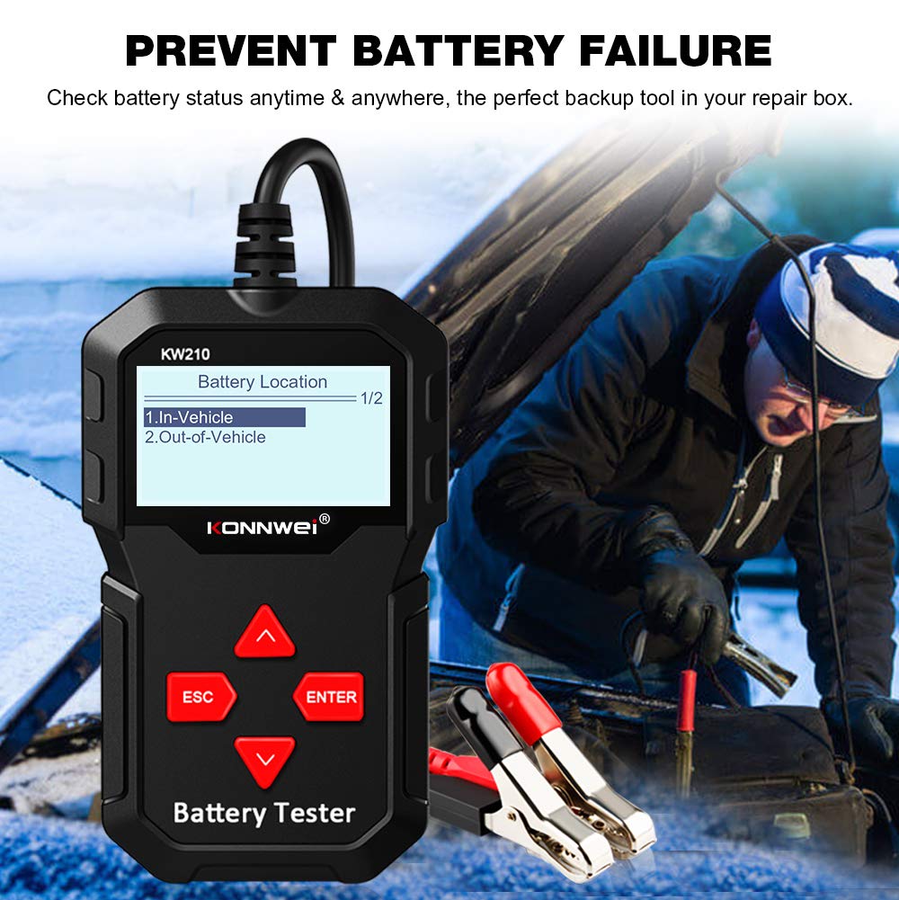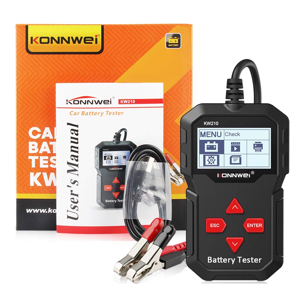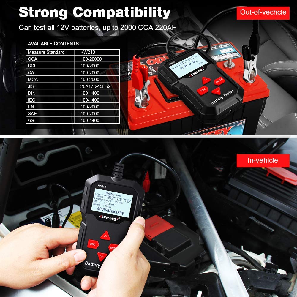 Analyze car battery problems and battery-related system issues to prevent battery failure with KONNWEI KW210 car battery tester. Designed with versatility and power in mind, it can test all 12V batteries with a wide test range from 100 to 2000 CCA, compatible with regular flooded, AGM flat plate, AGM spiral, GEL batteries, etc.