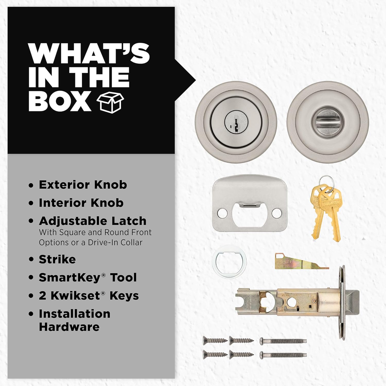 The box includes: wrench outer knob, interior knob, screws, adjustable latch, 2 keys, attack plate, smart tool, installation hardware, installation guide