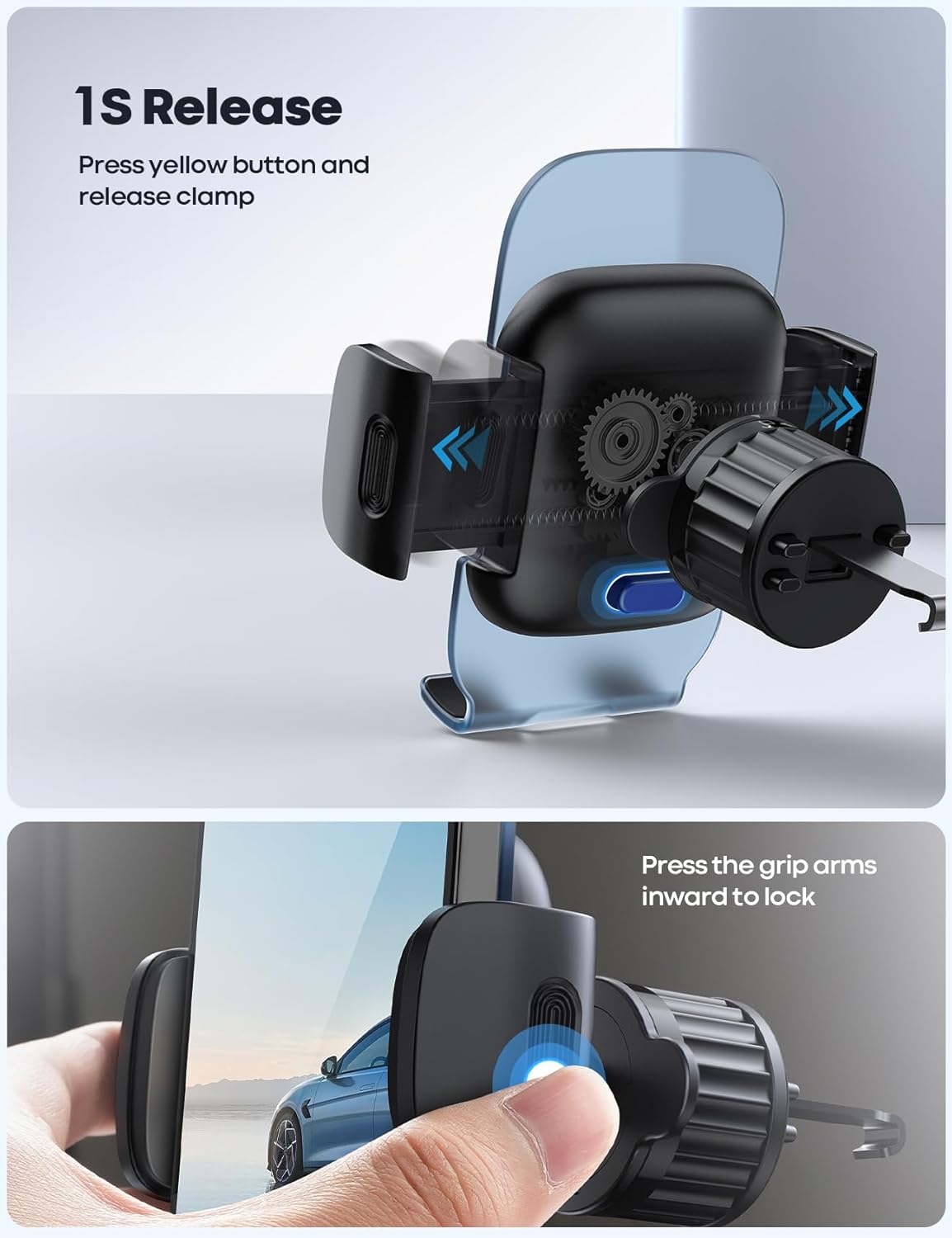 One Hand Place & Pick: This Phone bracket for car supports smooth Place & Pick, Only takes 0.5 seconds to release botton with one finger. 360 rotation clamp gives you the best viewing angle no matter your needs.