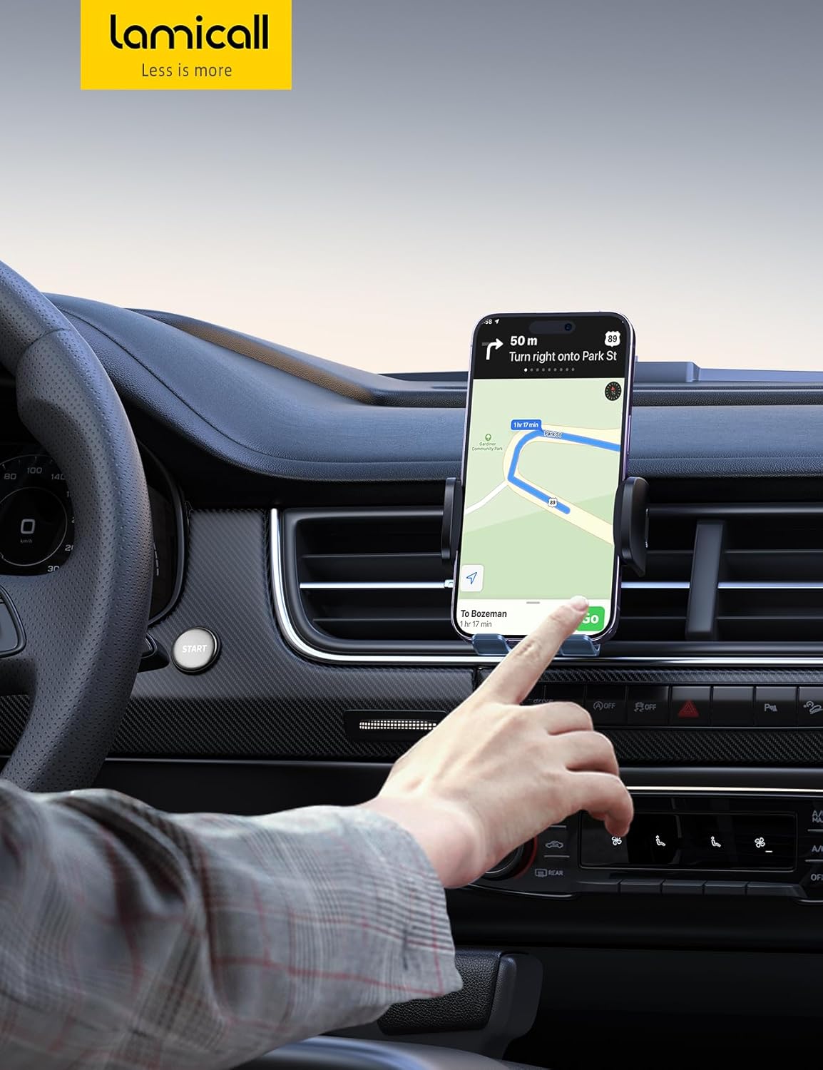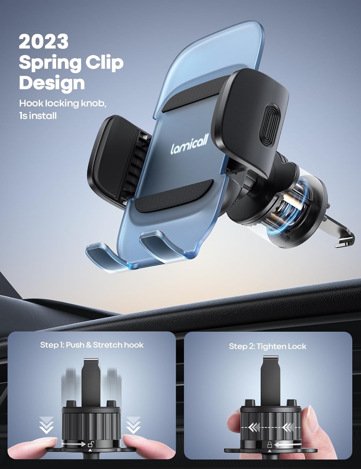 Spring Clip Design & 1s Install: Lamicall car phone mount uses automatic elastic spring clip and metal hook, just insert the hook into the air vent and it will fit automatically. 1s tighten and lock, One-hand operation, no need for repeated adjustments!