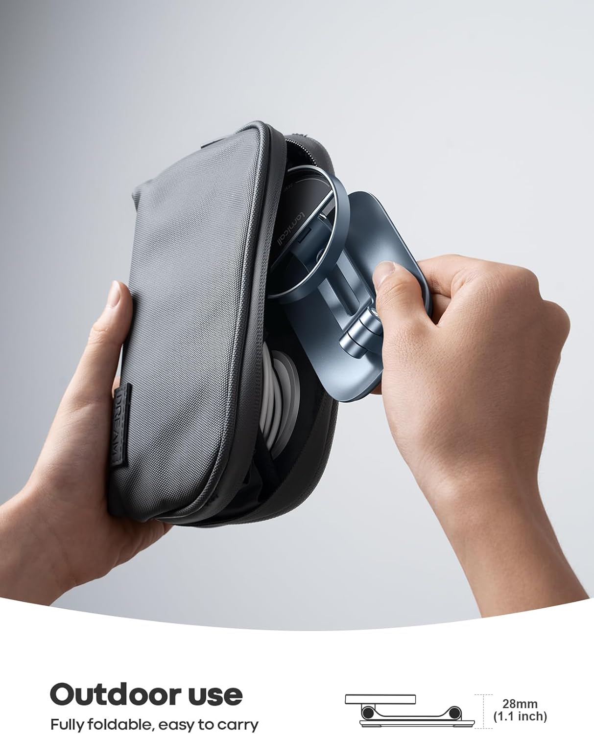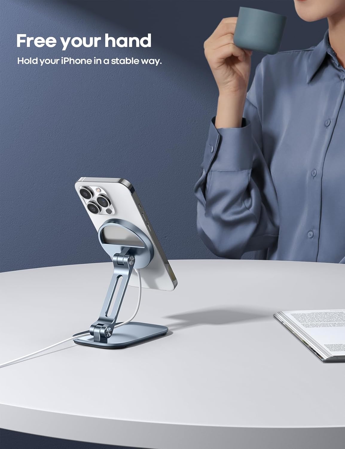 【Versatile and Convenient】Our Mag Safe holder features a double hinge folding design. Easily adjust it to achieve the perfect viewing angle for seamless Facetime calls, immersive movie viewing, or convenient recipe checking. This versatile phone dock is also ideal for placing on your nightstand, keeping your device within reach while you recharge it for the next day.