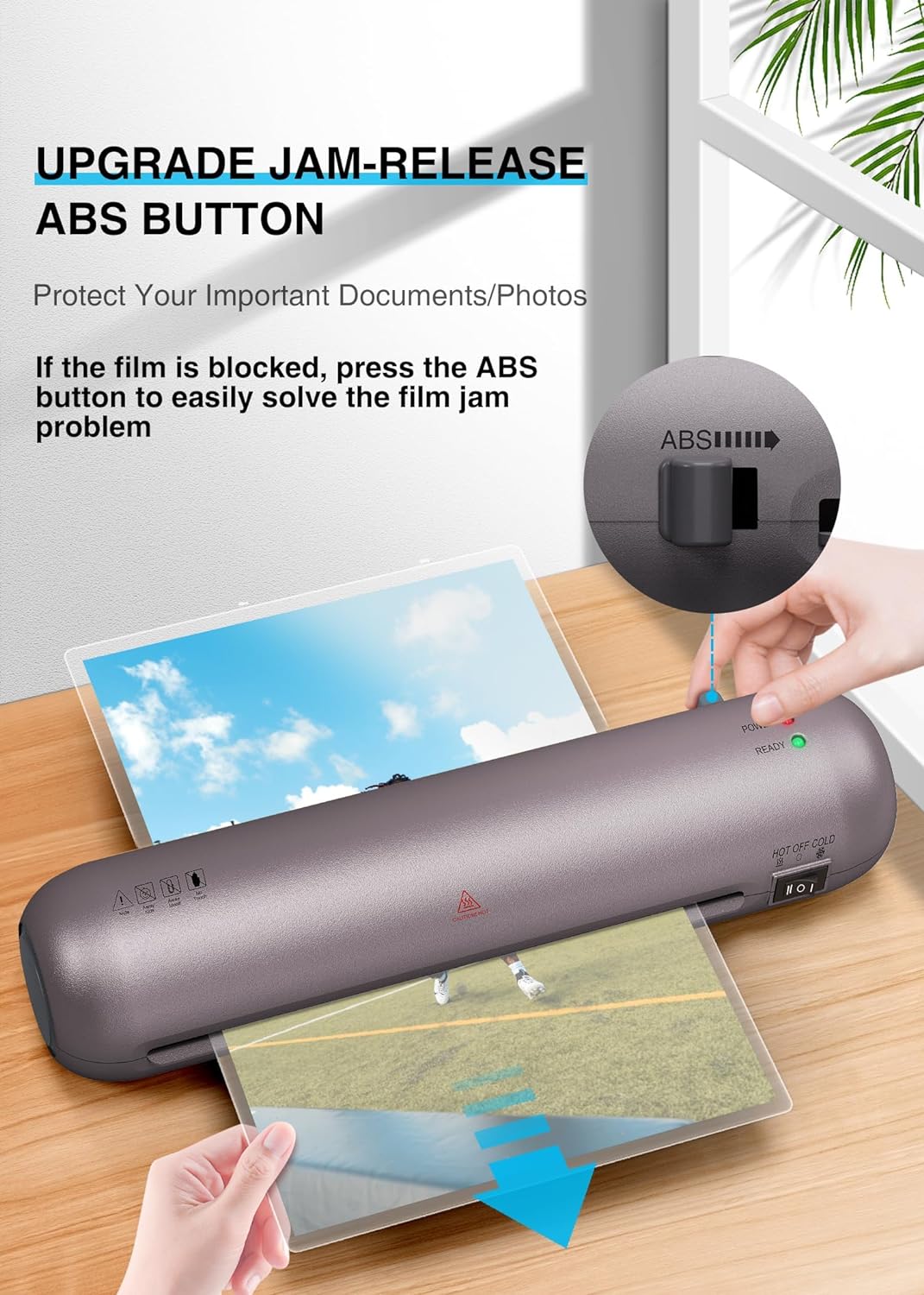 ➤【 】To avoid paper jams and stress during operation, improved SL280 lamination ABS jam release function. If the film is stuck, please turn off the device and then press the ABS button to easily solve the film jam problem.