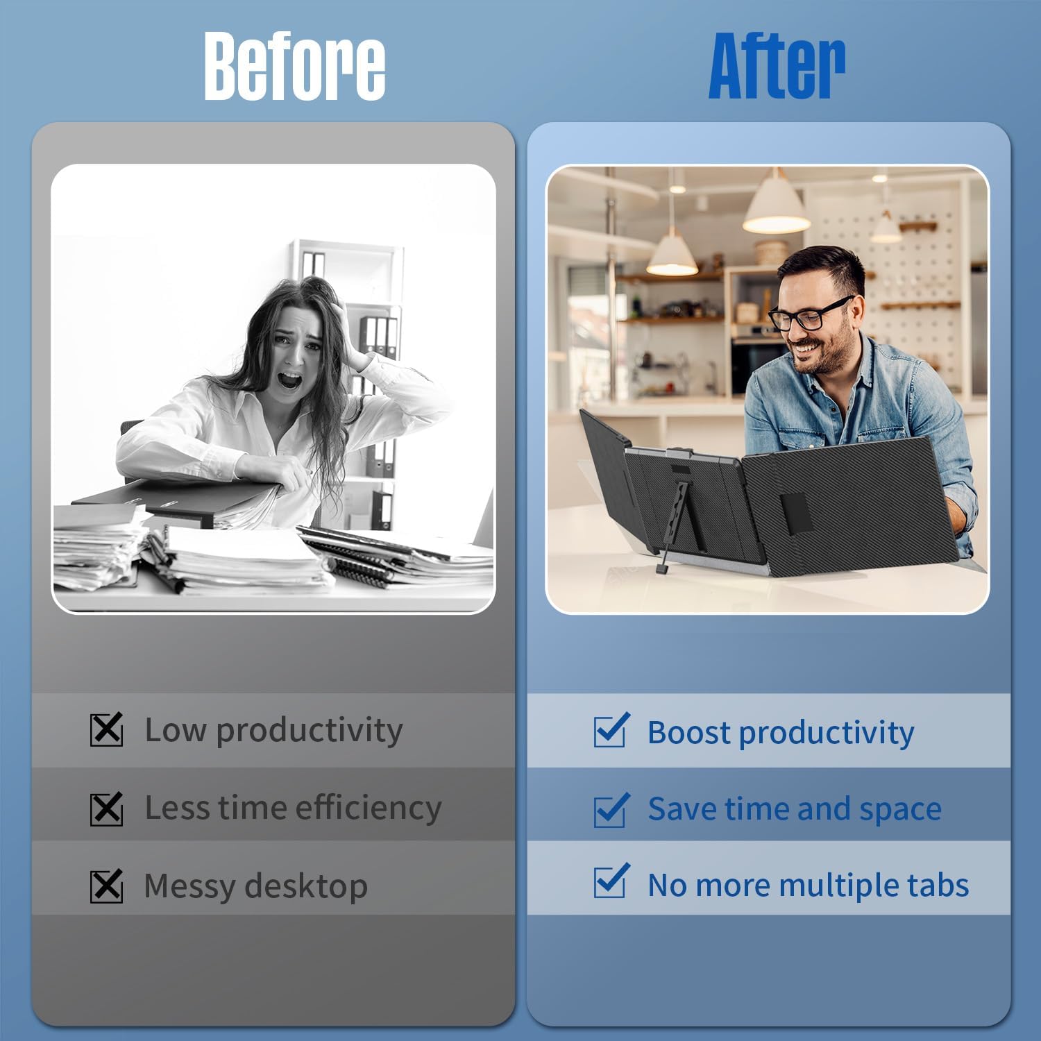 Let's turn your laptop screen into 3 monitors, with the additional 2 screens capable of stretch/mirror mode to expand your laptop's multi-screen synchronization and differentiation, allowing you to multitask simultaneously and increase productivity up to by 300%.