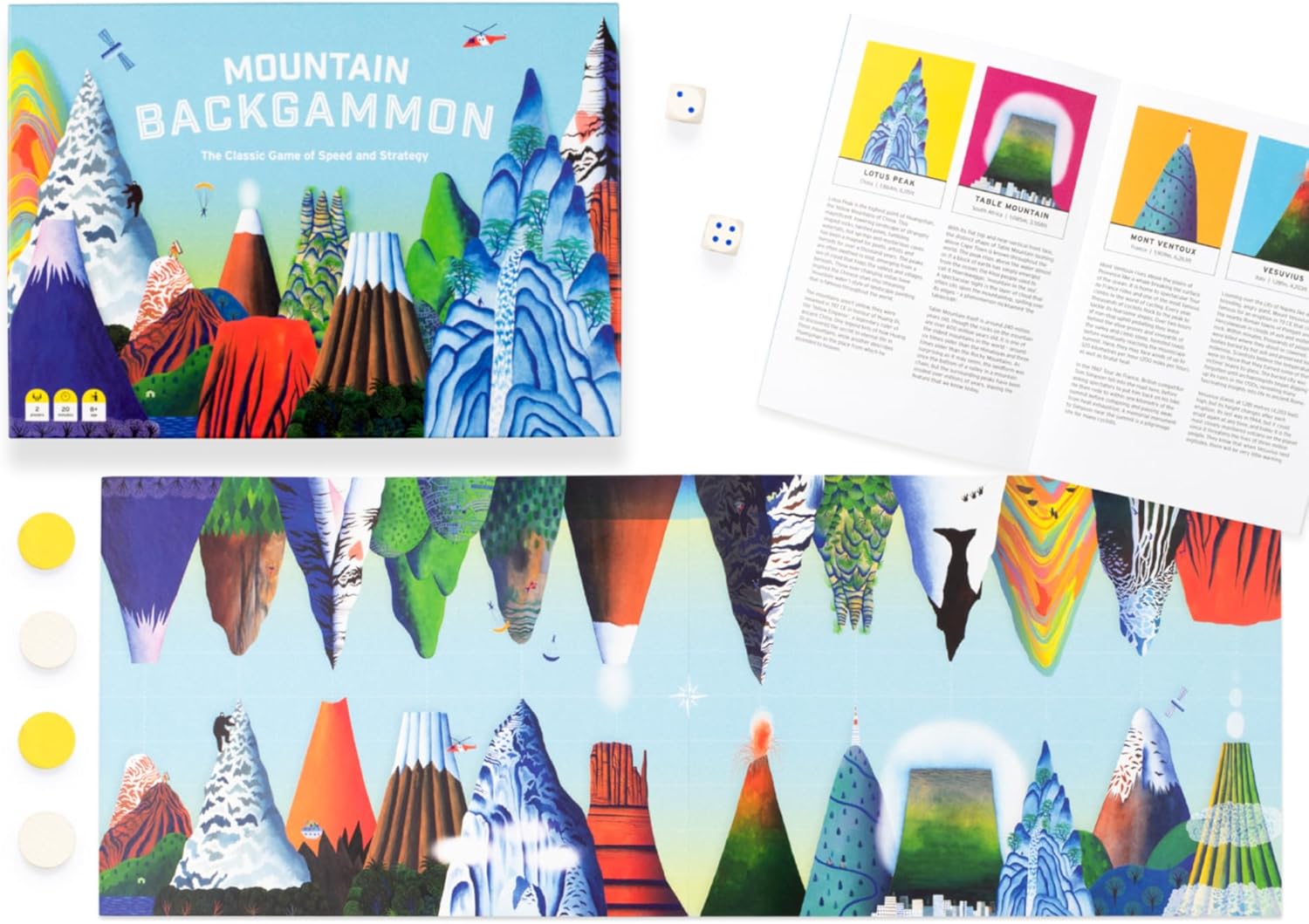 PLAY AND LEARN: Each point on the backgammon board is represented by one of the most incredible mountains in the world. Enjoy the detailed illustrations and learn more in the accompanying booklet.