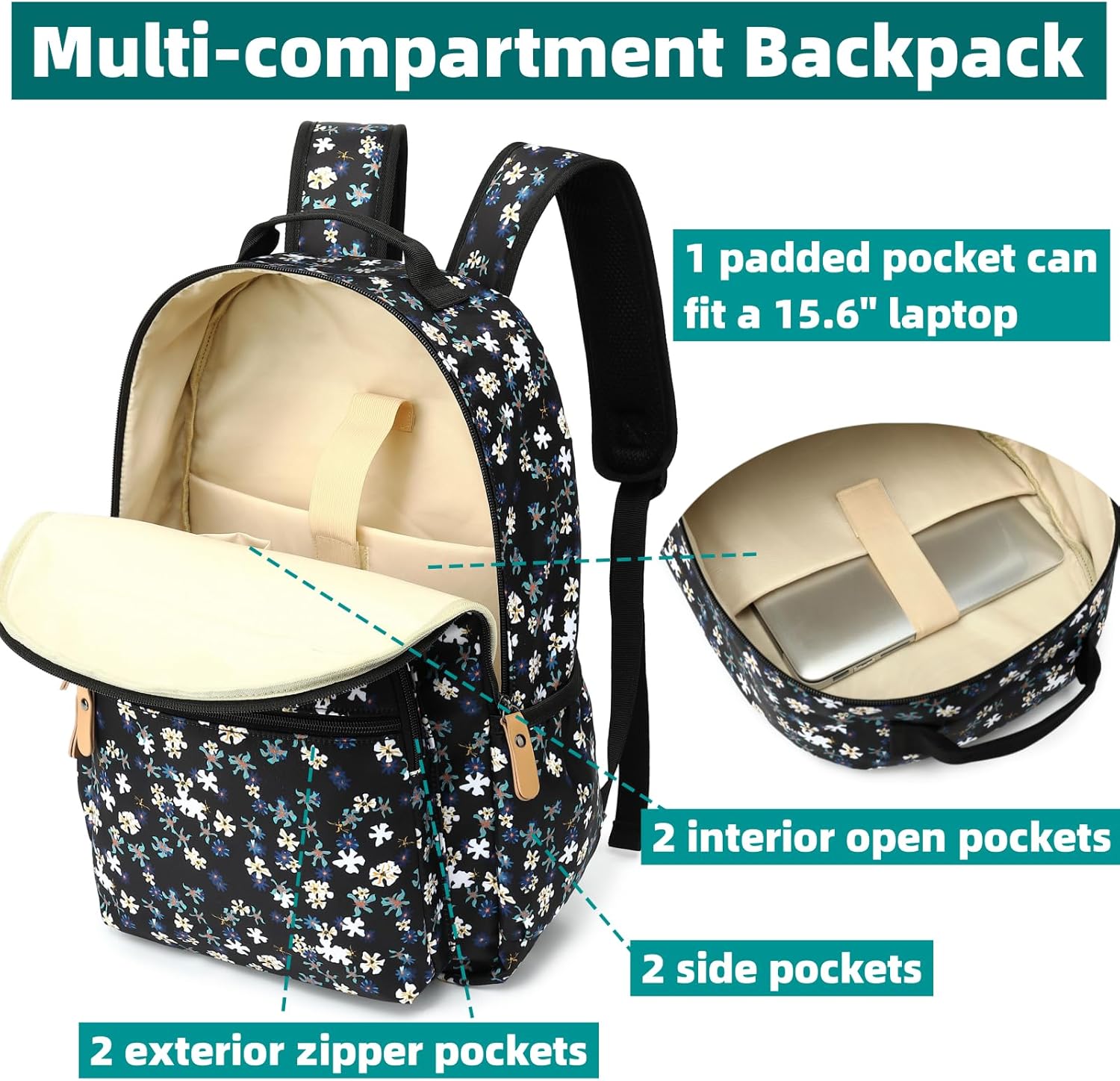 Organized & Large Capacity: Main compartments with double zipper closure; 2 exterior zipper pockets; water bottle pockets on both sides; 1 padded pocket(can fit 15.6 inch laptop); 2 interior open pockets; 2 interior zipper pockets; 1 thickened back pocket.