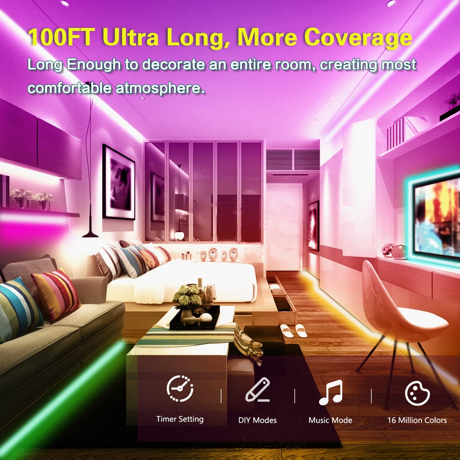 The LED light package comes with 2 rolls of 50 feet, that is 100 feet in total. The length is long enough to decorate every corner you want. LED strip lights can illuminate the entire house and offer you a great lighting experience.