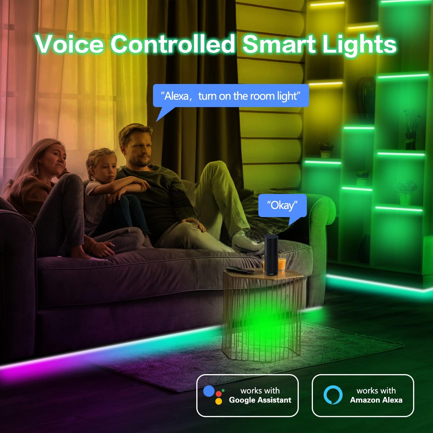 Voice Control: LED lights can be controlled by voice commands using Alexa and Google Assistant.